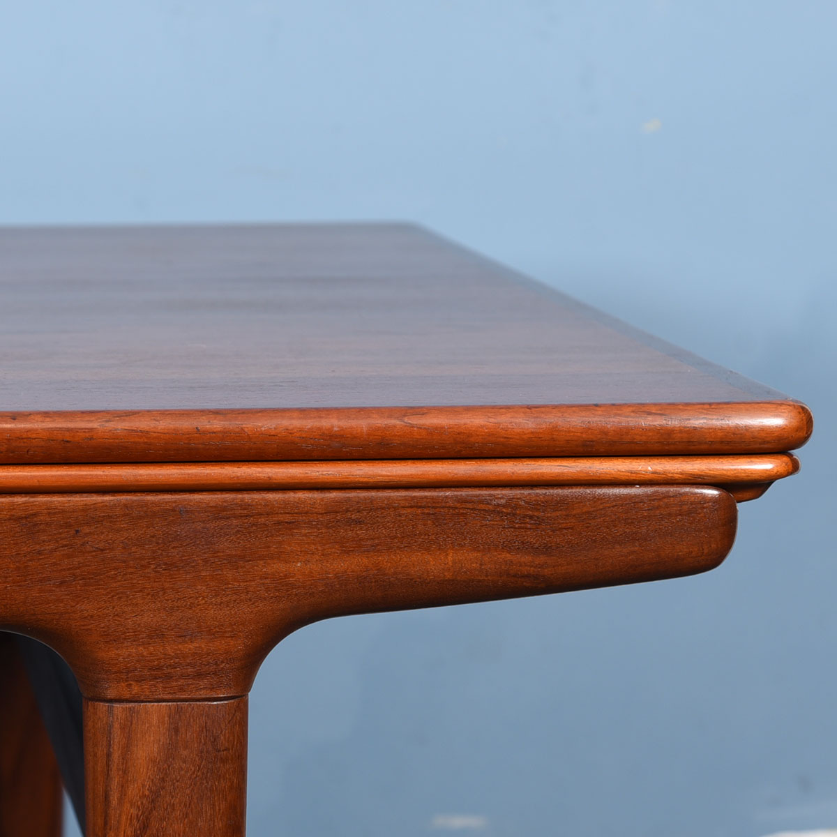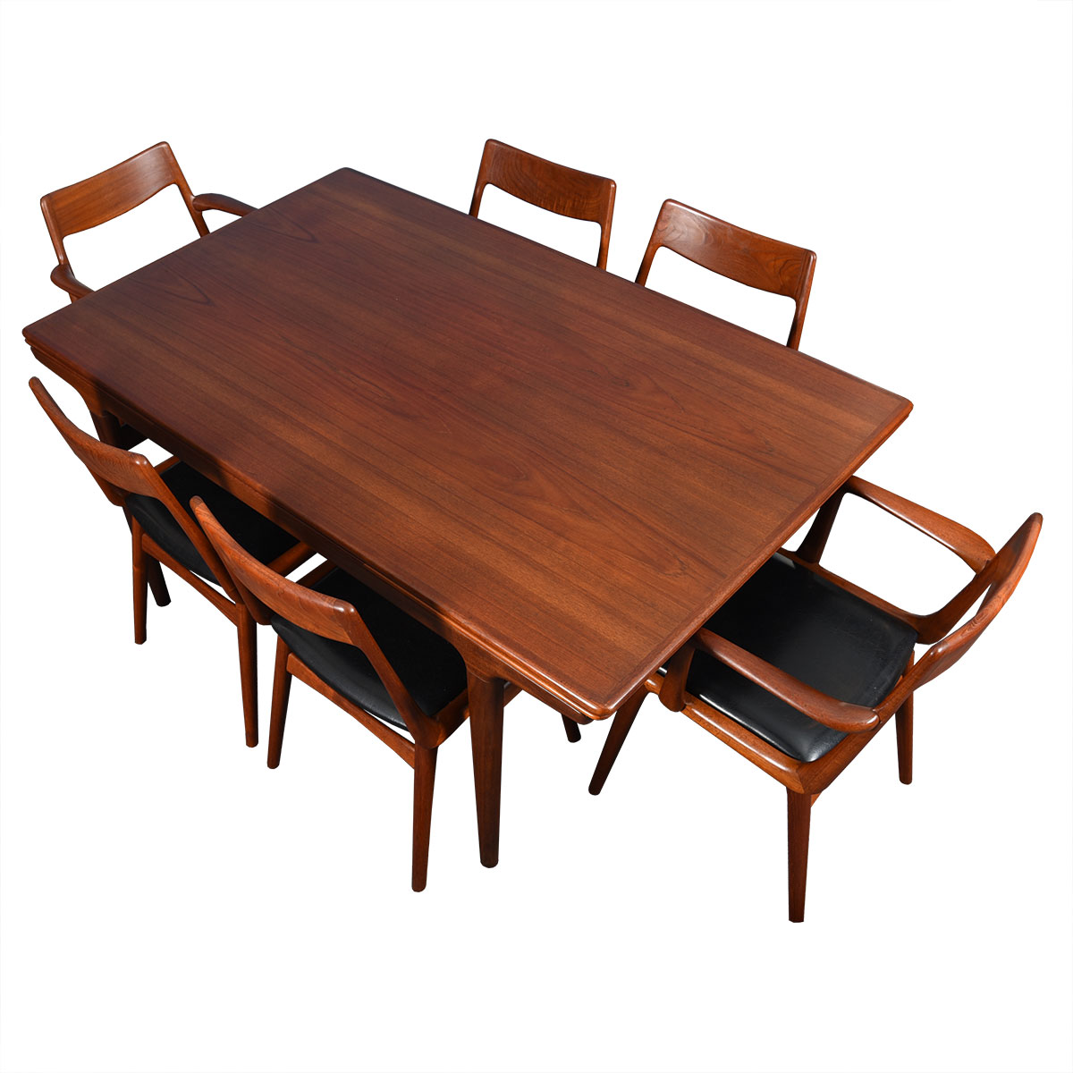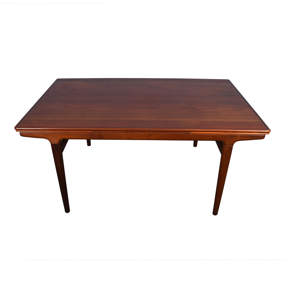 This beautiful old Danish Modern table was designed by Johannes Andersen. It has a sleek profile due to the shape of the legs and the way the table top is positioned. A leaf pulls out from either end to extend the length of the table.