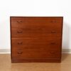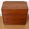 We are pleased to offer several pieces in this wonderful storage system designed by Peter Hvidt and crafted of solid teak. With its eight sculpural crescent handles, it has the appearance of a dresser but look again — the top four are actually on a drop down door which opens to create a work area including small drawers inside for sundry items. Below, there are two deep drawers for storage. Makes a wonderful piece in a small bedroom combining workspace and clothing storage, or a practical piece in an office or kitchen. Use it alone or in conjunction with some of the other pieces we offer.