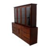 There’s an impressive amount of storage in this 2 piece rosewood sideboard and glass fronted display cabinet! On the bottom, there are three deep drawers on either side of the central doors. These doors swing open to shelving space. The 4-door glass front cabinet has adjustable shelves that easily allow for display of taller items. The handles are sculptural and are darker, complimenting the darker interior of the cabinet. The figuring in the rosewood grain is lovely with warm tones.