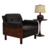 - The gorgeous rosewood frame is fortified with plump black leather cushions on the back, seat and armrest, allowing one to sink right in