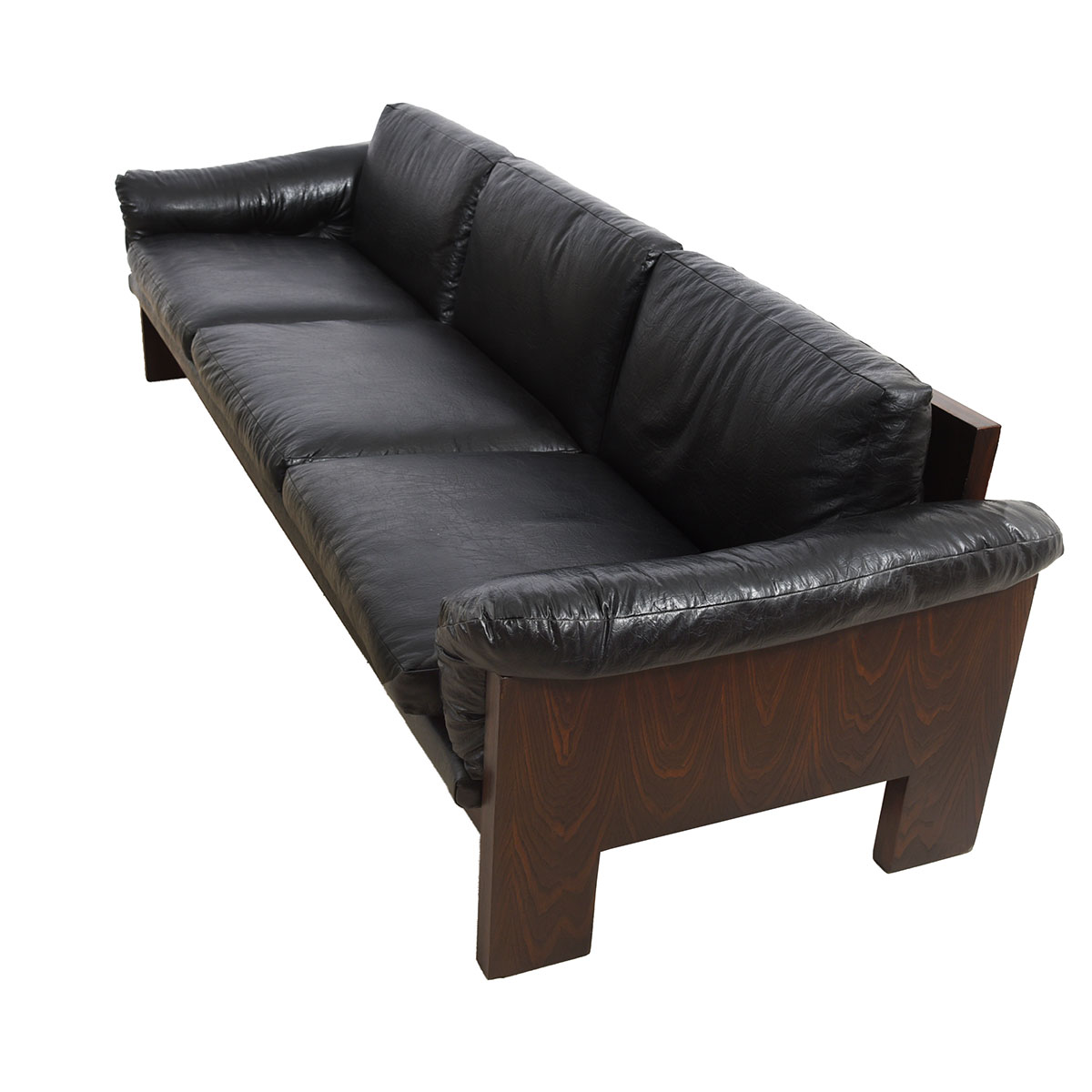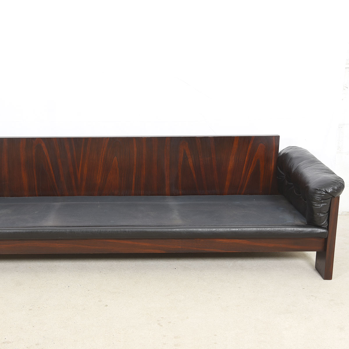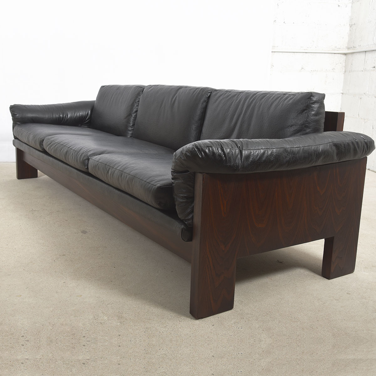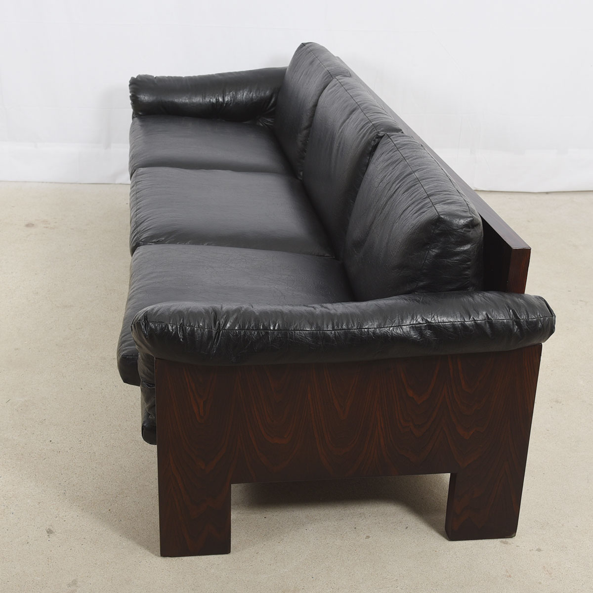 A case of rosewood with striking grain holds the black cushions of this three-seat sofa. Designed by Milo Baughman in the 1970s for Thayer Coggin, this is mid-century luxury at its finest.