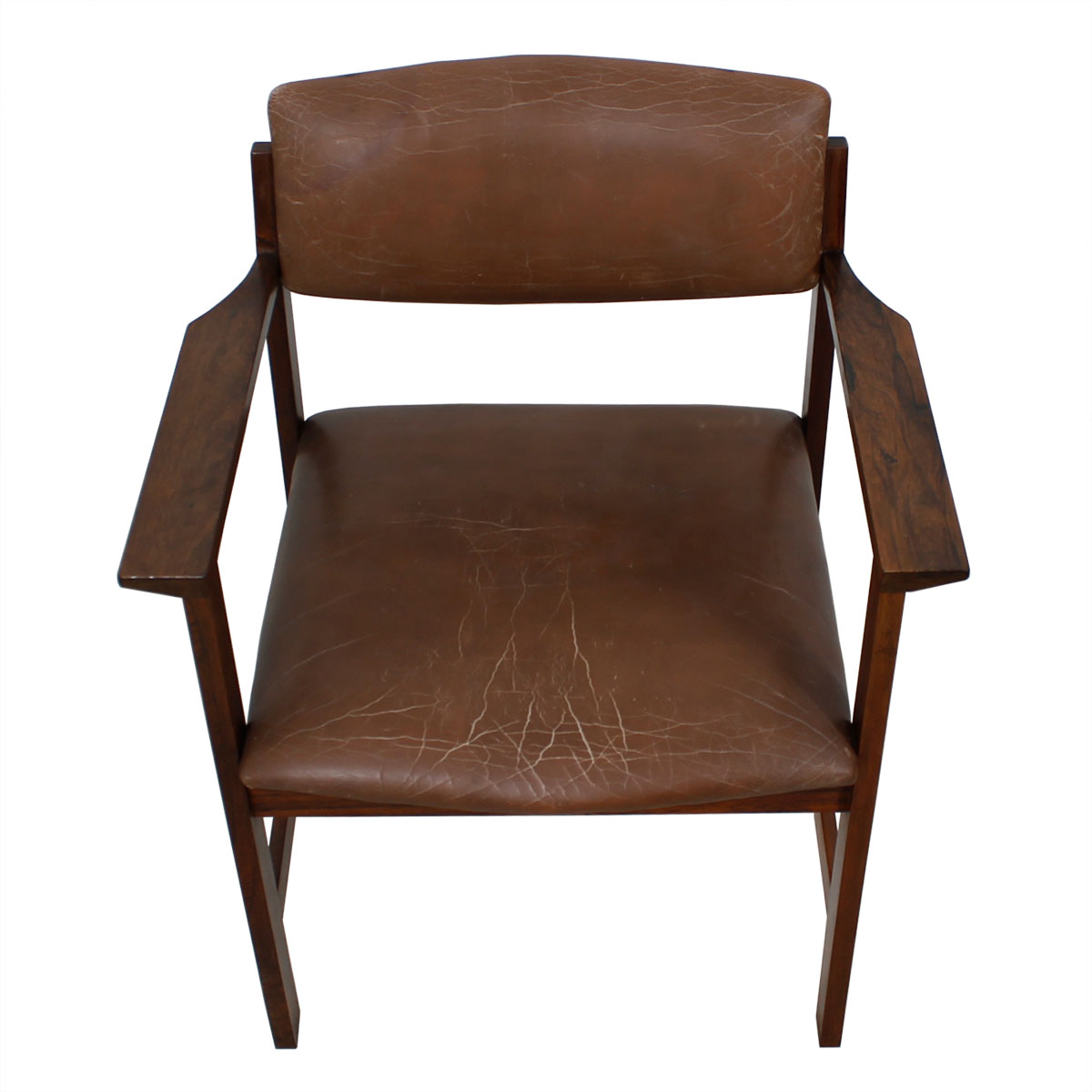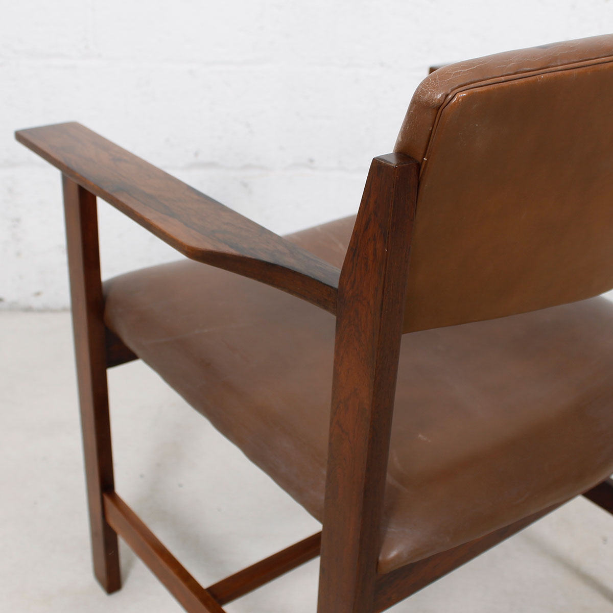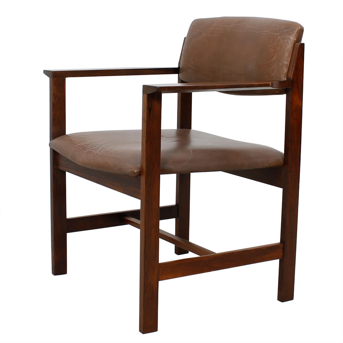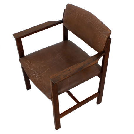 The seat and backrest are upholstered in milk chocolate brown leather, which has aged to a wonderful patina that complements the rosewood perfectly.