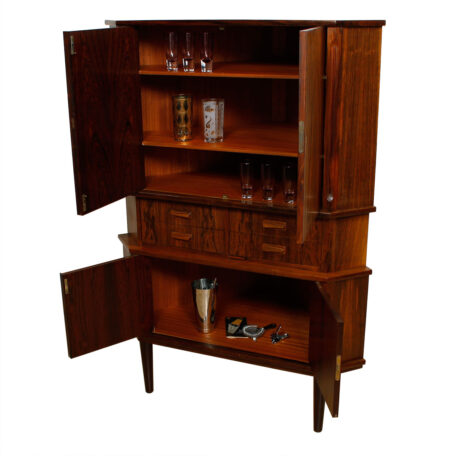 We are pleased to offer this fabulous Danish Modern corner cabinet / bar in rosewood. The grain on the doors has been carefully placed for maximum decorative effect, and the rosewood has aged well so that the exciting patterning is more visible.