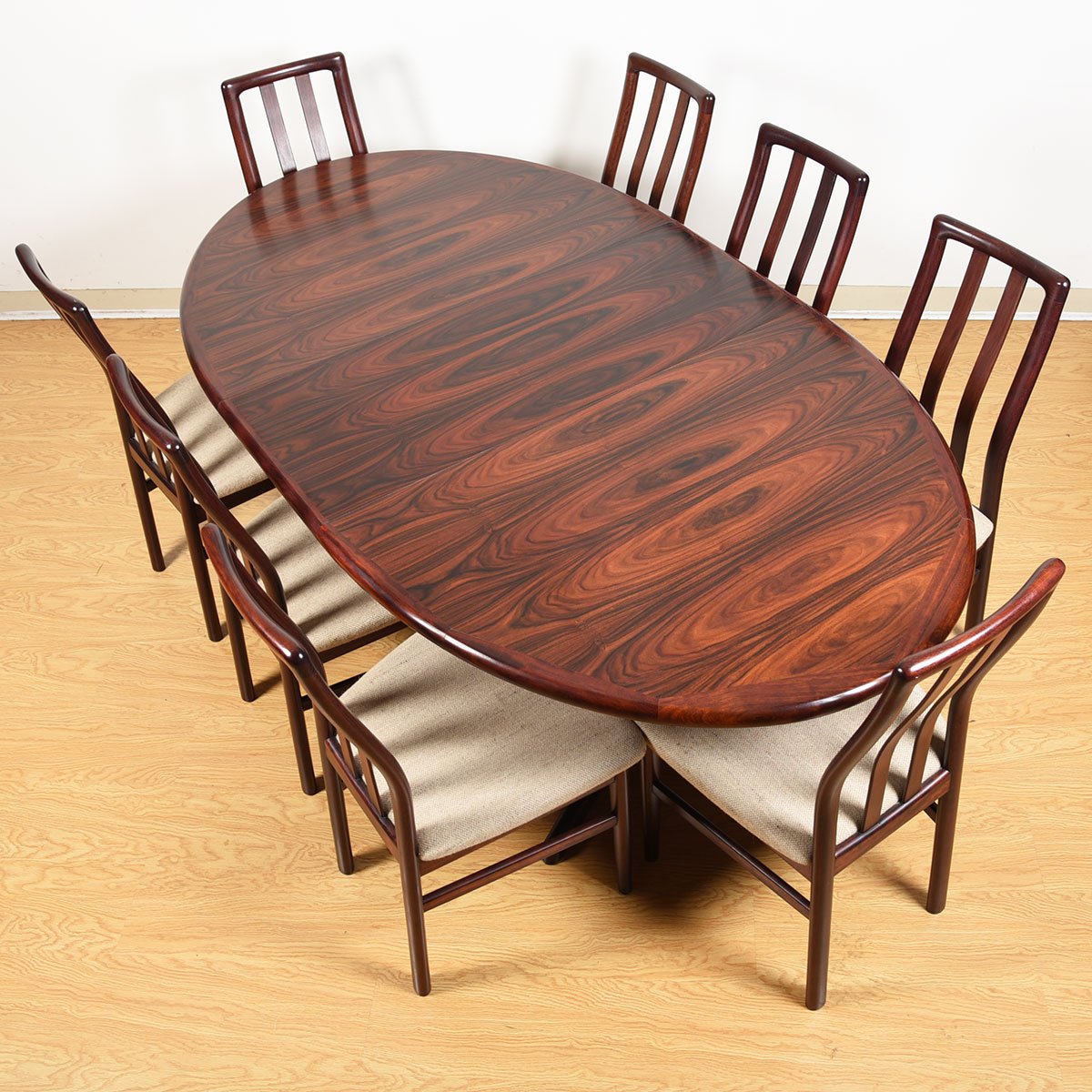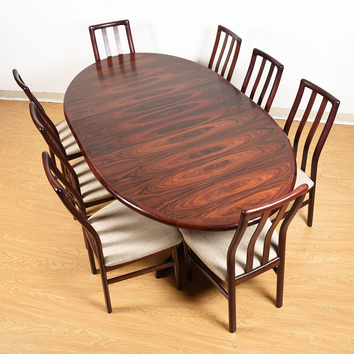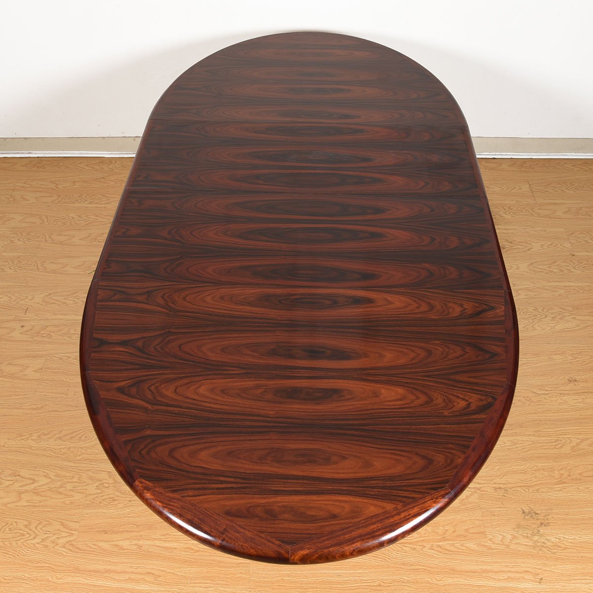 You won’t want to hide the top of this incredible Danish Modern rosewood table under a tablecloth — look at how it has been cut and placed across the top surface to create a dynamic pattern. Accented with edge band detailing gives a finished look.