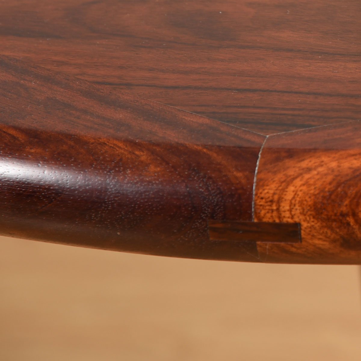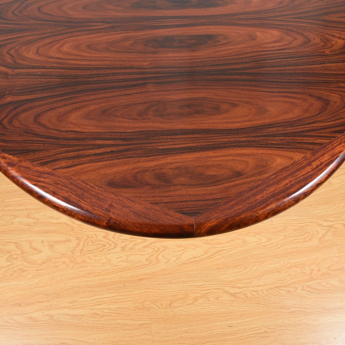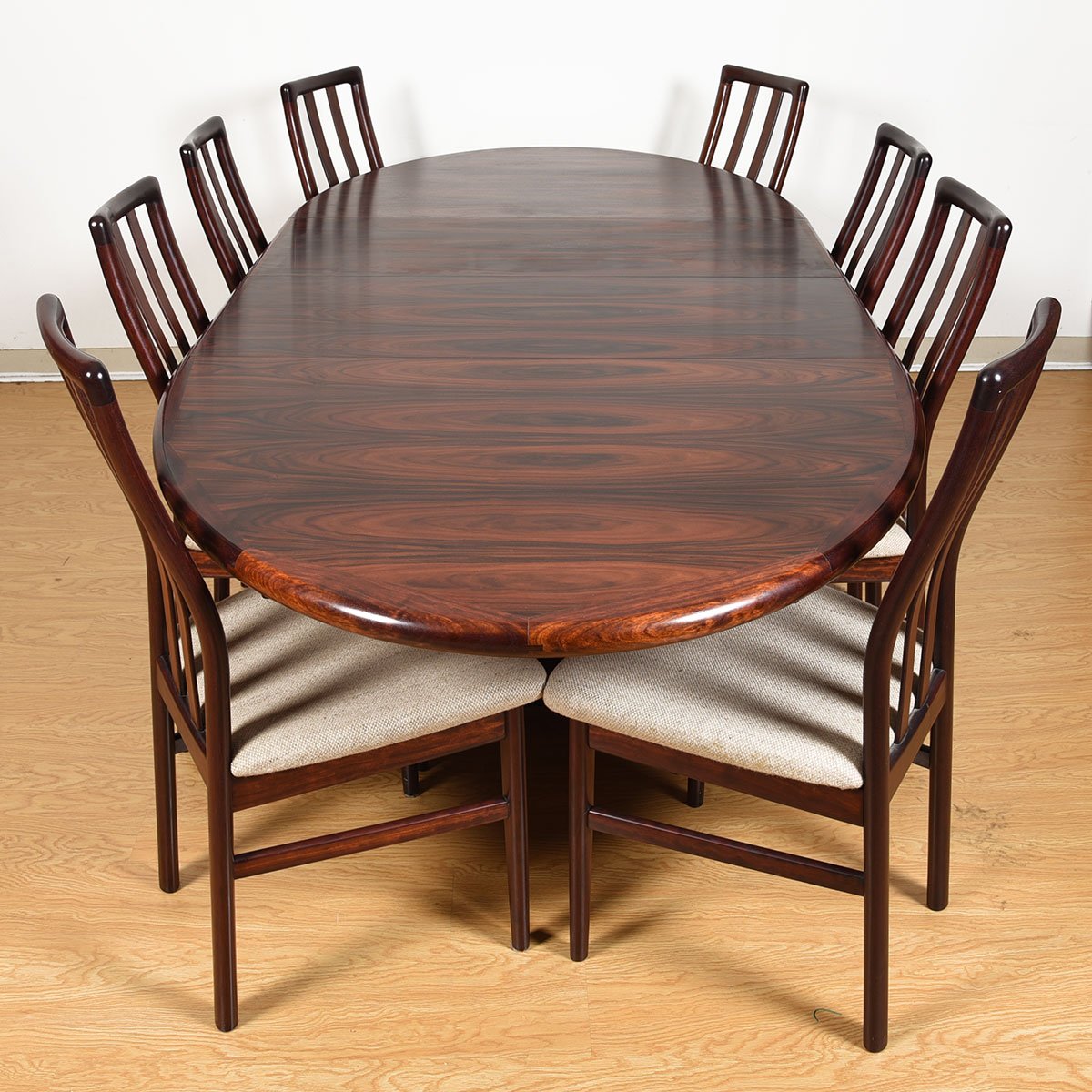 You won’t want to hide the top of this incredible Danish Modern rosewood table under a tablecloth — look at how it has been cut and placed across the top surface to create a dynamic pattern. Accented with edge band detailing gives a finished look.