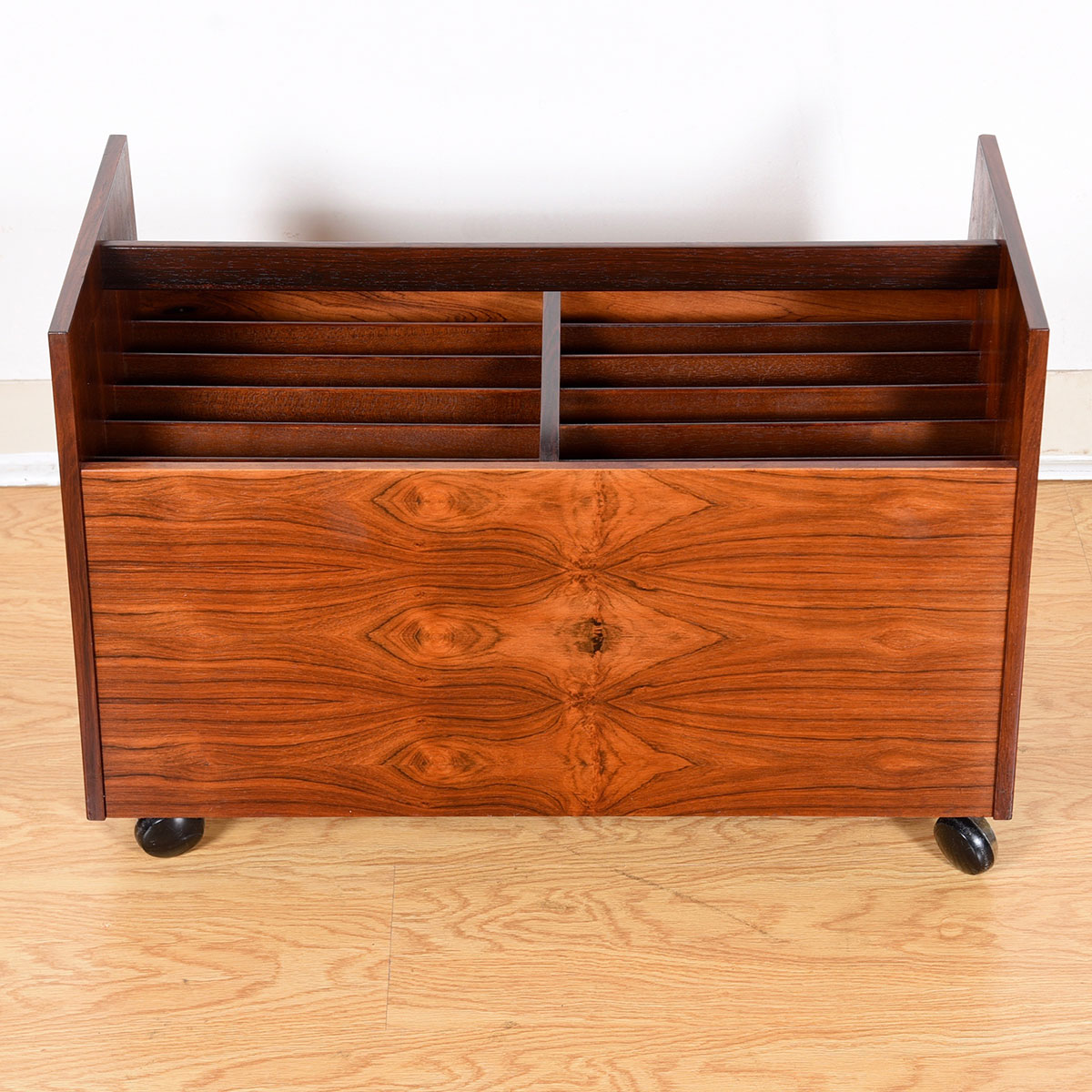 Norwegian Rosewood Rolling Magazine Cart / Organizer. Perfect size for Vinyl Record Albums. Also Useful for Magazines, Books, Childrens’ Toys, or Craft Items! A Great Way to Organize in Danish Modern Style!