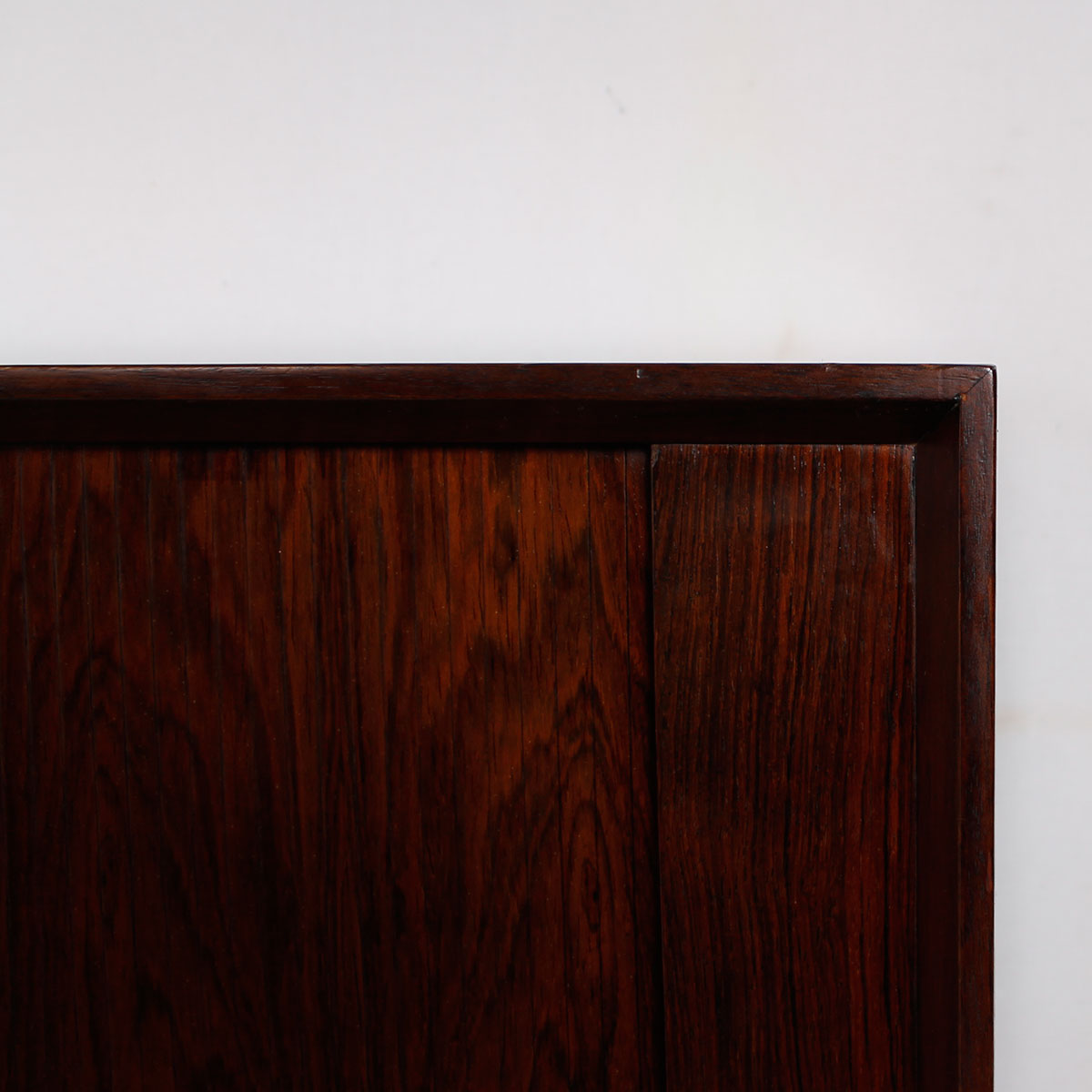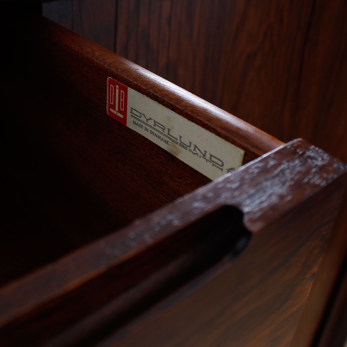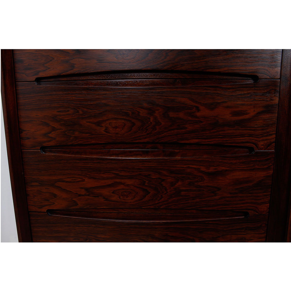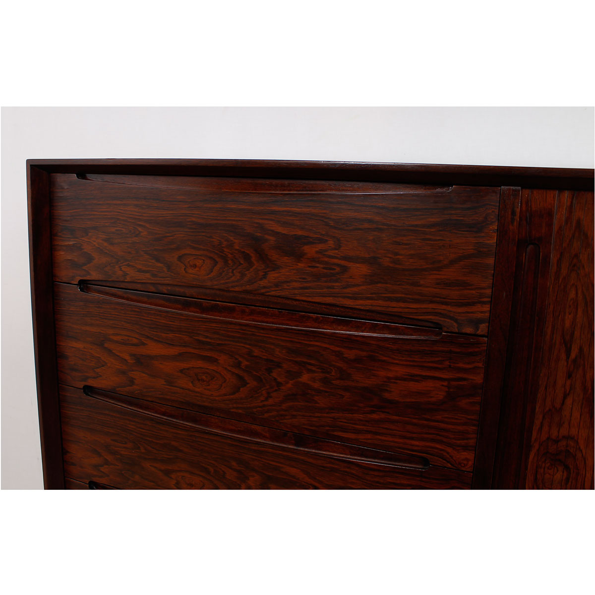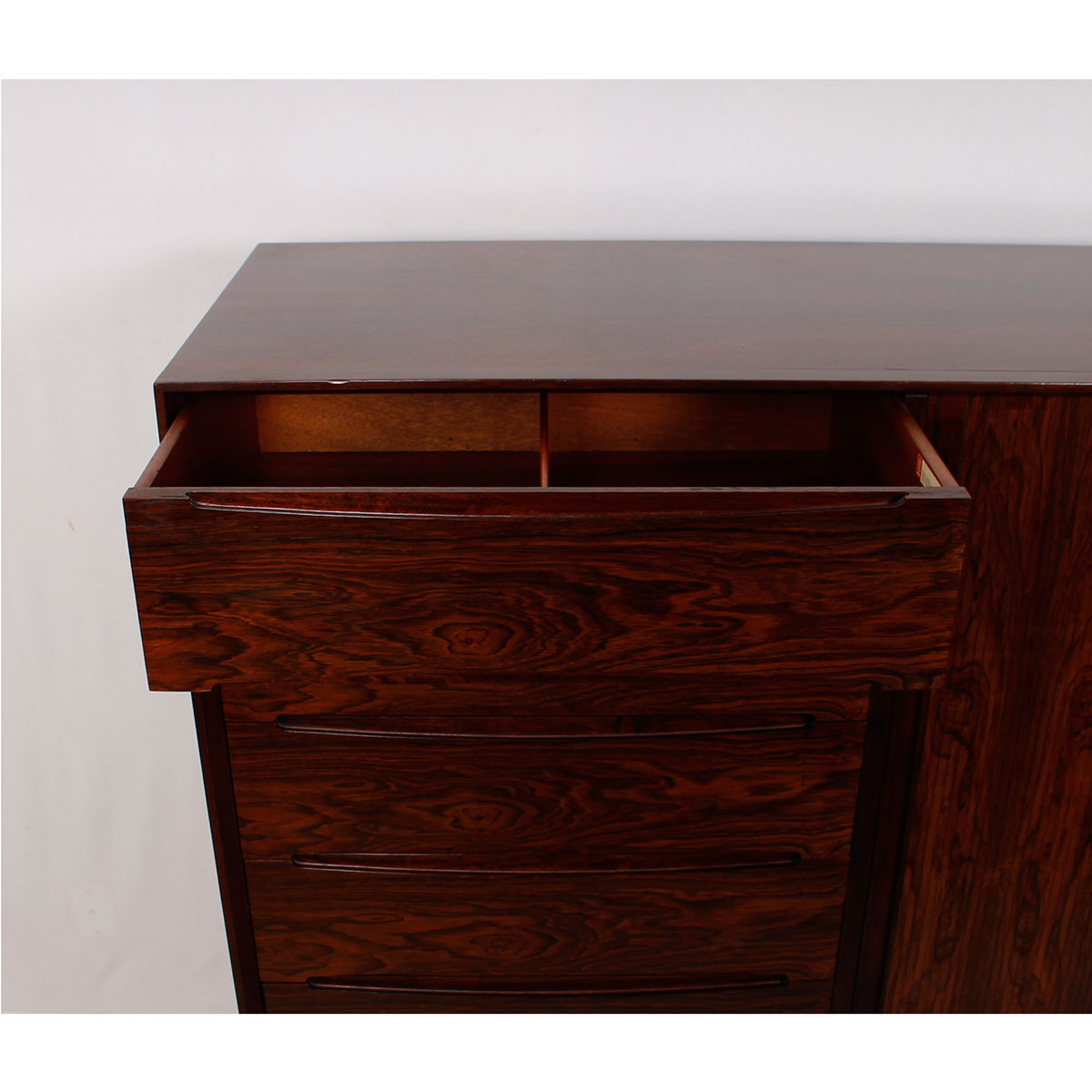 Gorgeous ‘Gentlemen’s Chest’. A fabulous hard-to-find piece! 7 drawers on left with an additional bank of graduated drawers on the right behind the sliding tambour door. Finished on the back. The brilliantly grained rosewood accentuates the straight-lined minimalist style of this piece and will have you mesmerized! By Dyrlund, Denmark.