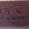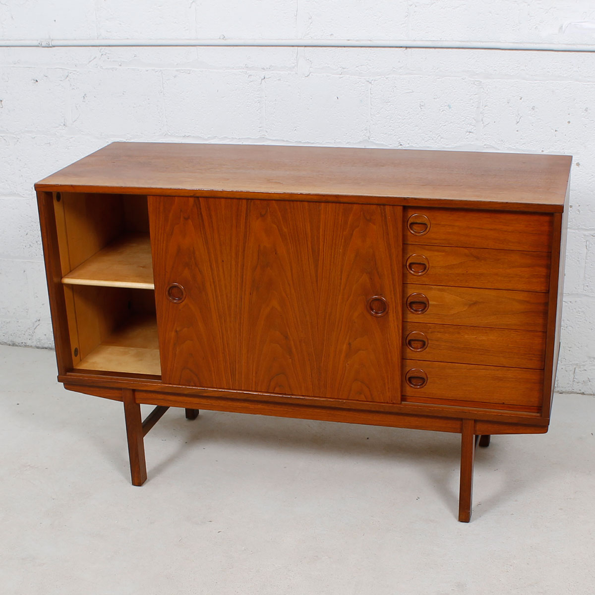 Lovely older Danish Modern sideboard in a compact size, great for smaller spaces. Would be perfect as a media cabinet, in a hallway as a catchall or in the bedroom as supplemental dresser storage. A sliding door on the left opens to reveal a cubby area with an adjustable shelf and there are five drawers on the right. The piece sits on a frame with squared legs. The round handles give the sideboard an overall playful quality. Manufactured by Dux, Sweden.