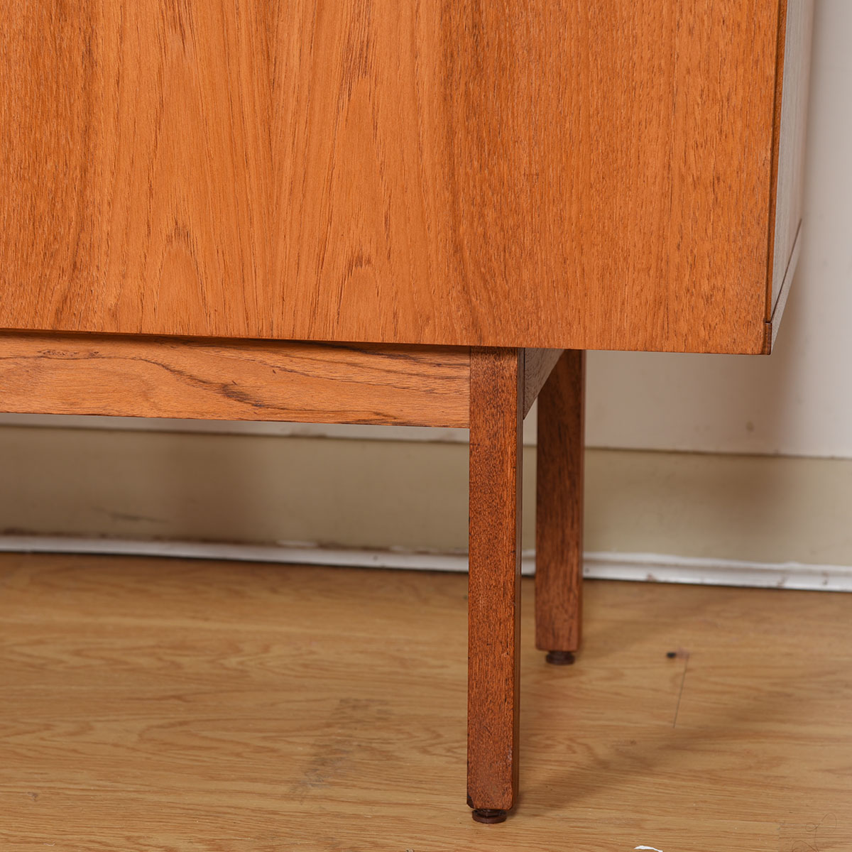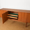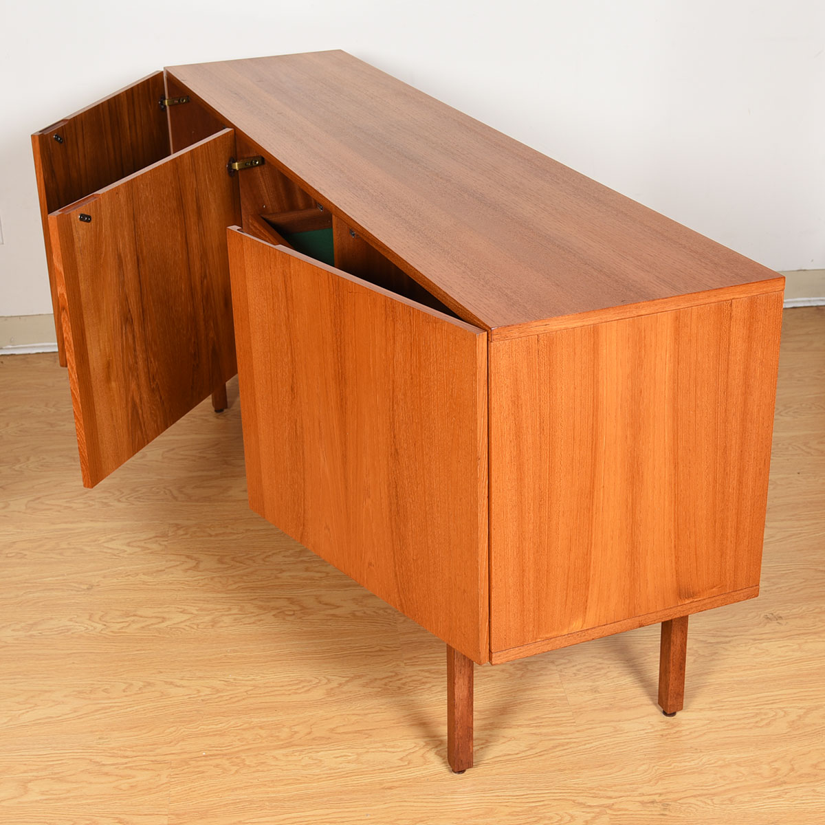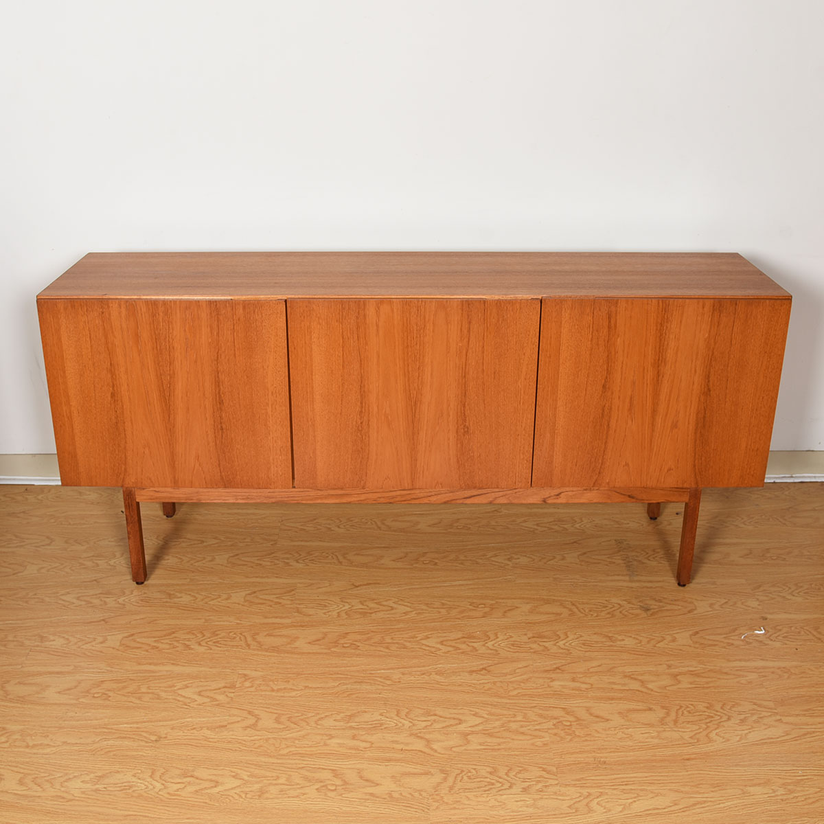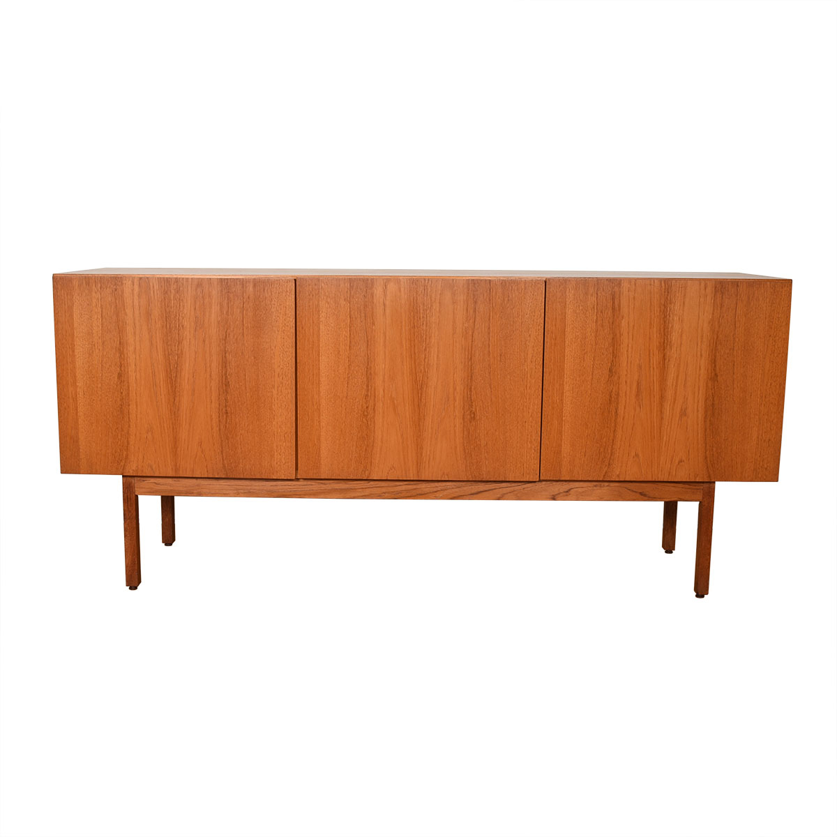 This gorgeous Danish Modern sideboard has no ornamention to distract from the essence of its minimalist design. Three doors that open out to reveal shelved space inside, plus two shallow drawers.