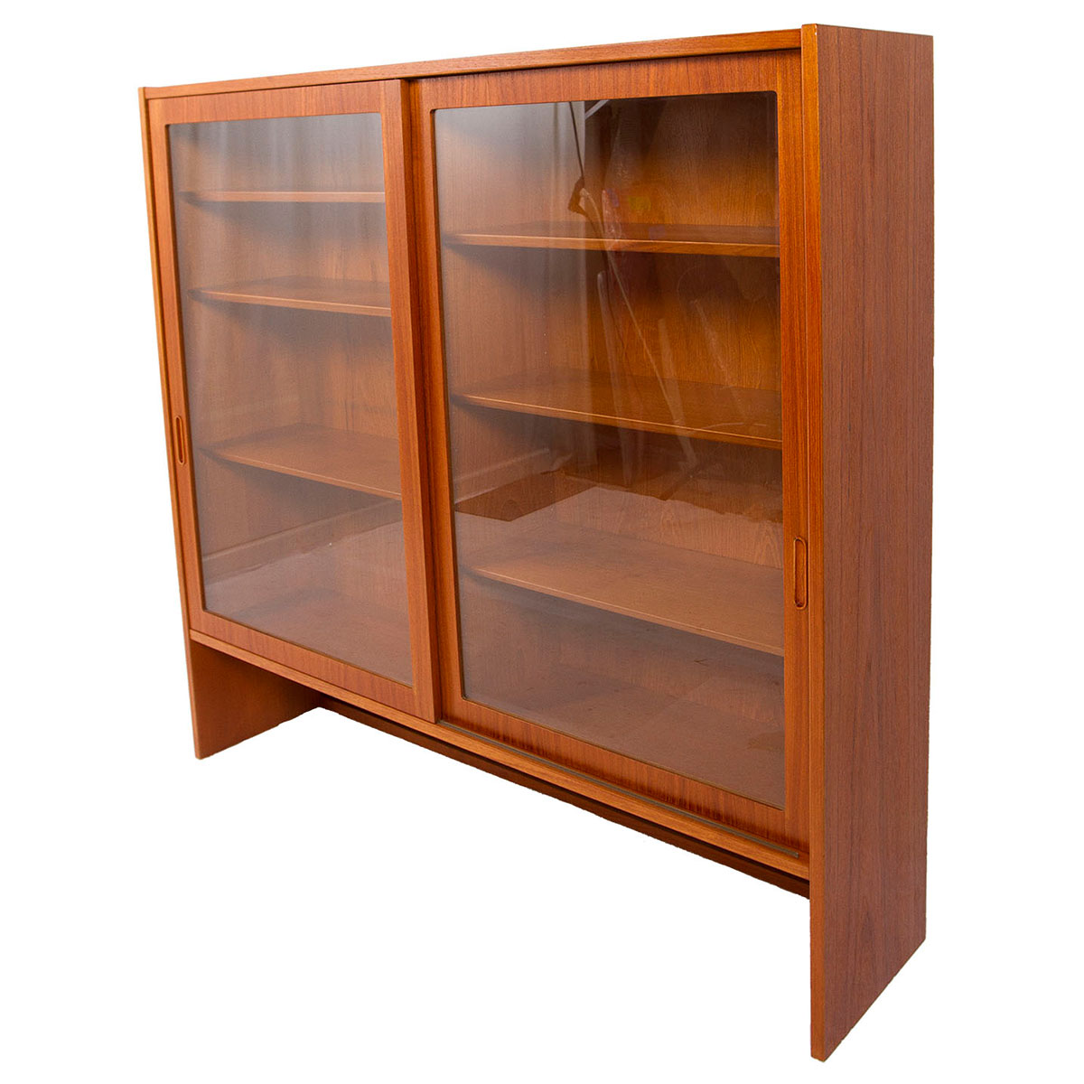 By Hundevad, Denmark. ALL of the Top Beveled Shelves Behind Sliding Glass Doors are Adjustable. Adjustable Shelves & One Felt Lined Drawer in Bottom Compartment for Additional Storage.