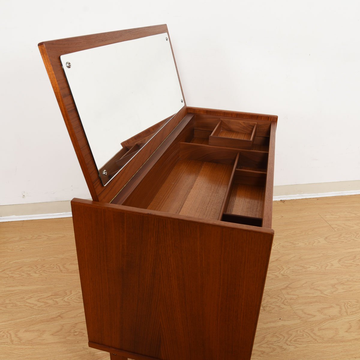 We are pleased to offer this lovely vanity or chest with mirror. The top lifts up to reveal a mirror and a drawer with compartments for small items such as cosmetics, jewelry or desk accessories. Compact size but provides good storage in a small space thanks to two additional spacious drawers.