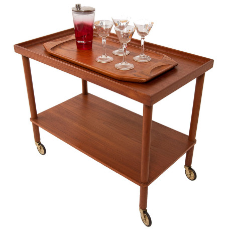 Well crafted Danish teak bar / serving cart with beveled edges around the trim of the top shelf and lower shelf molded around the legs.