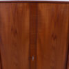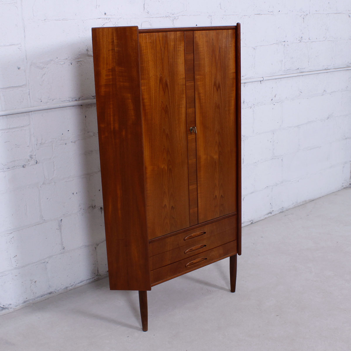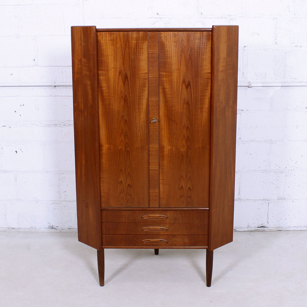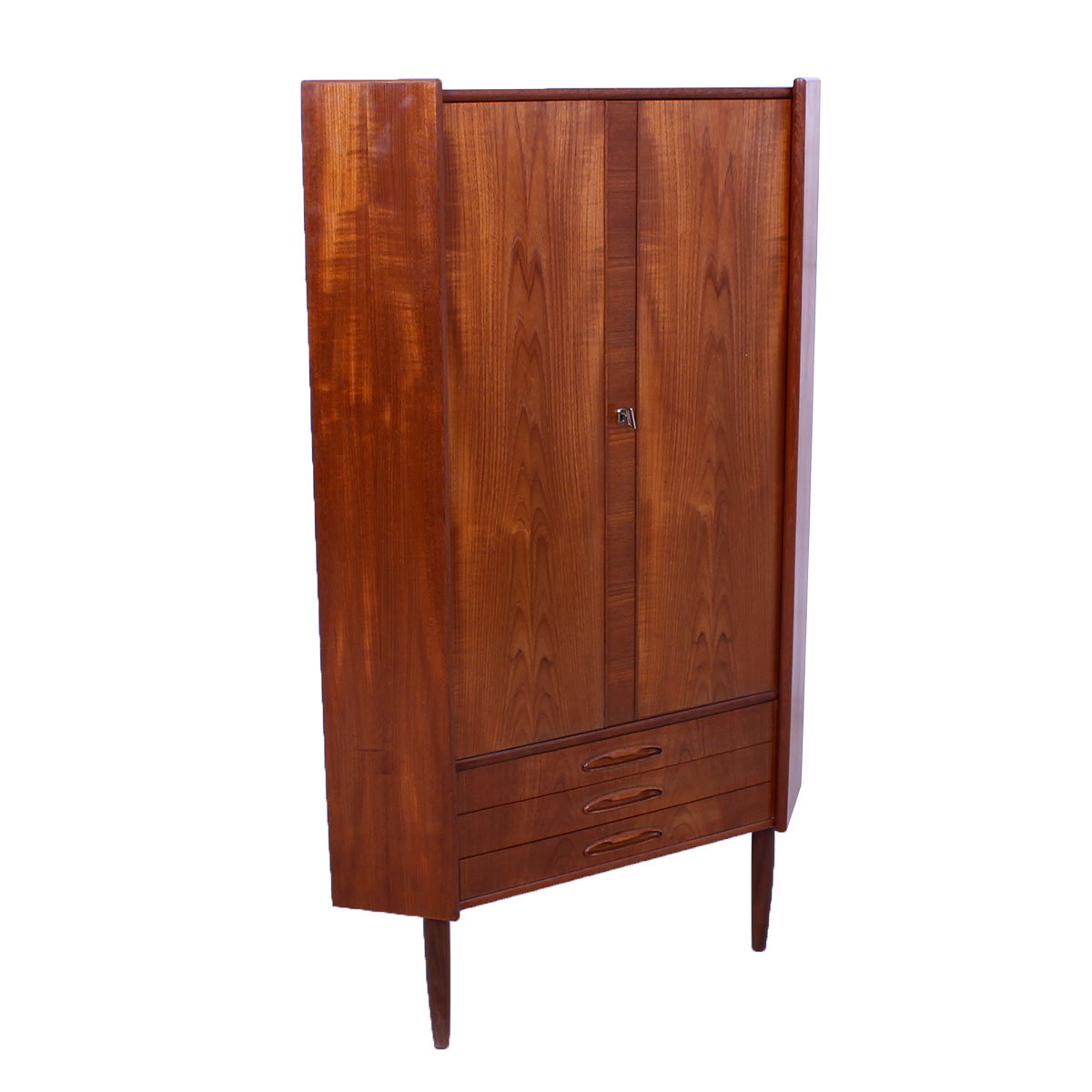 If you need to minimize space and maximize storage, this Danish teak corner cabinet is something to consider. The front is composed basically of two long doors on which the grain of the wood has been carefully placed to enhance the beauty of the piece. The doors open to two adjustable shelves, making it excellent for use as a corner bar cabinet or to store china and glassware for your table. Below are three drawers, each having an interesting oval inset pull with a sculptural lip overhang. The cabinet locks for your convenience in case you want to keep children out of the way of precious goods.