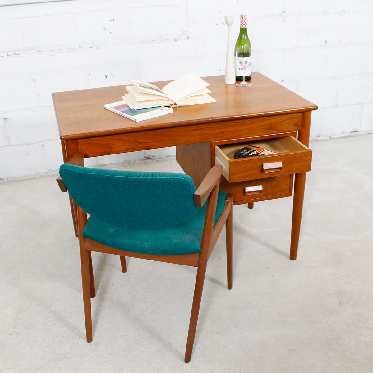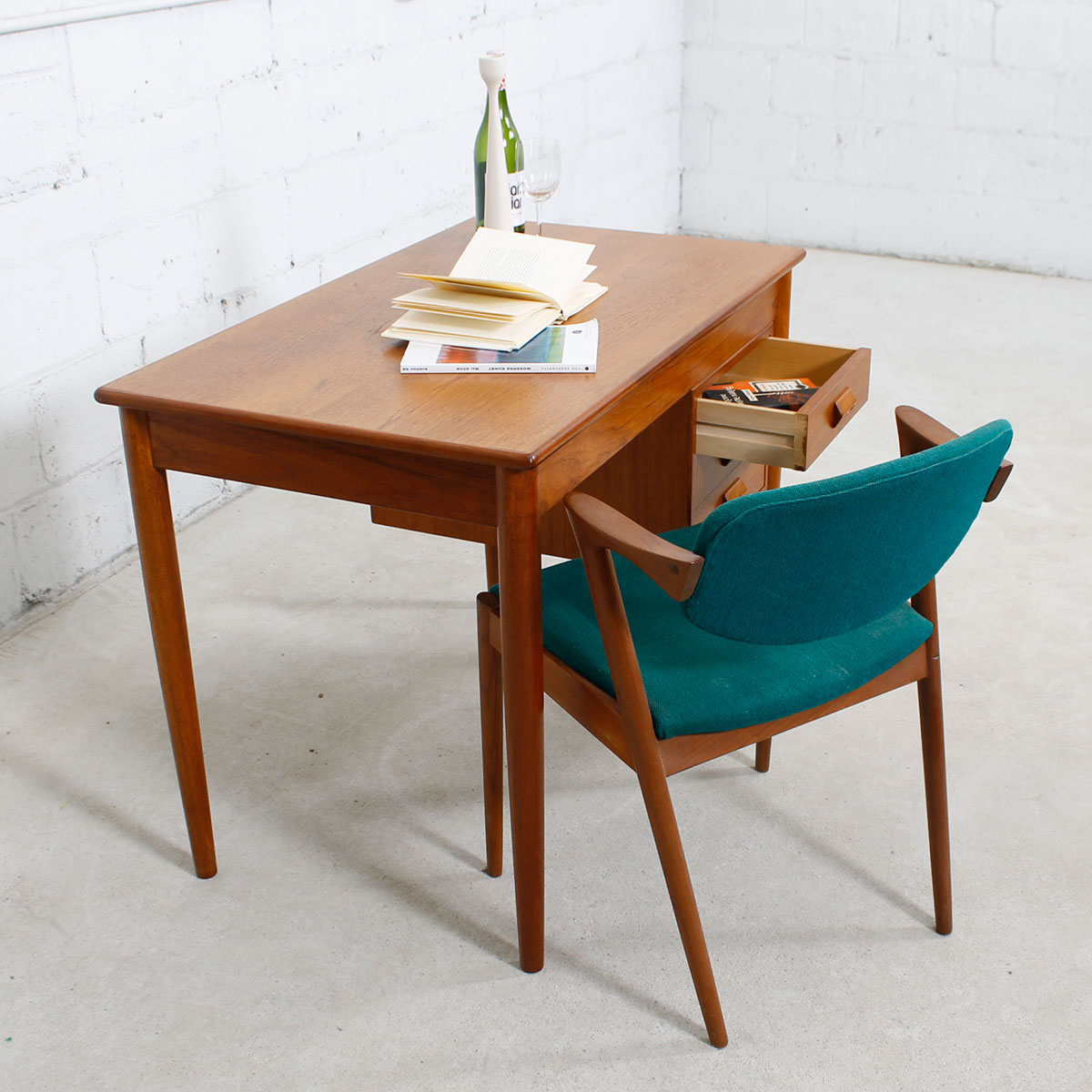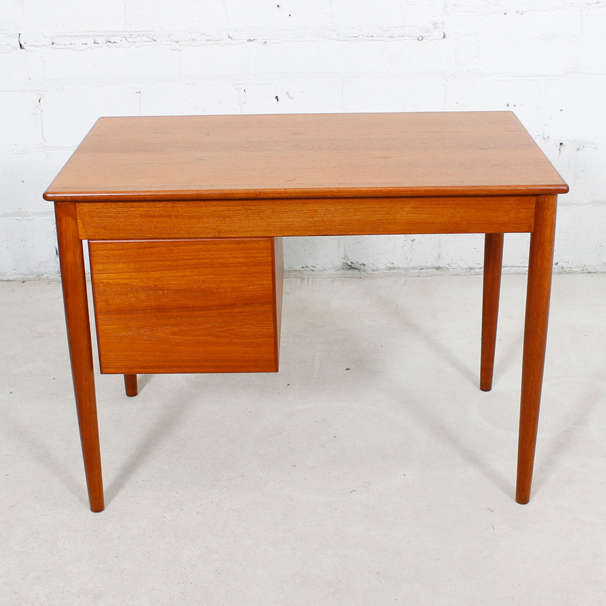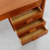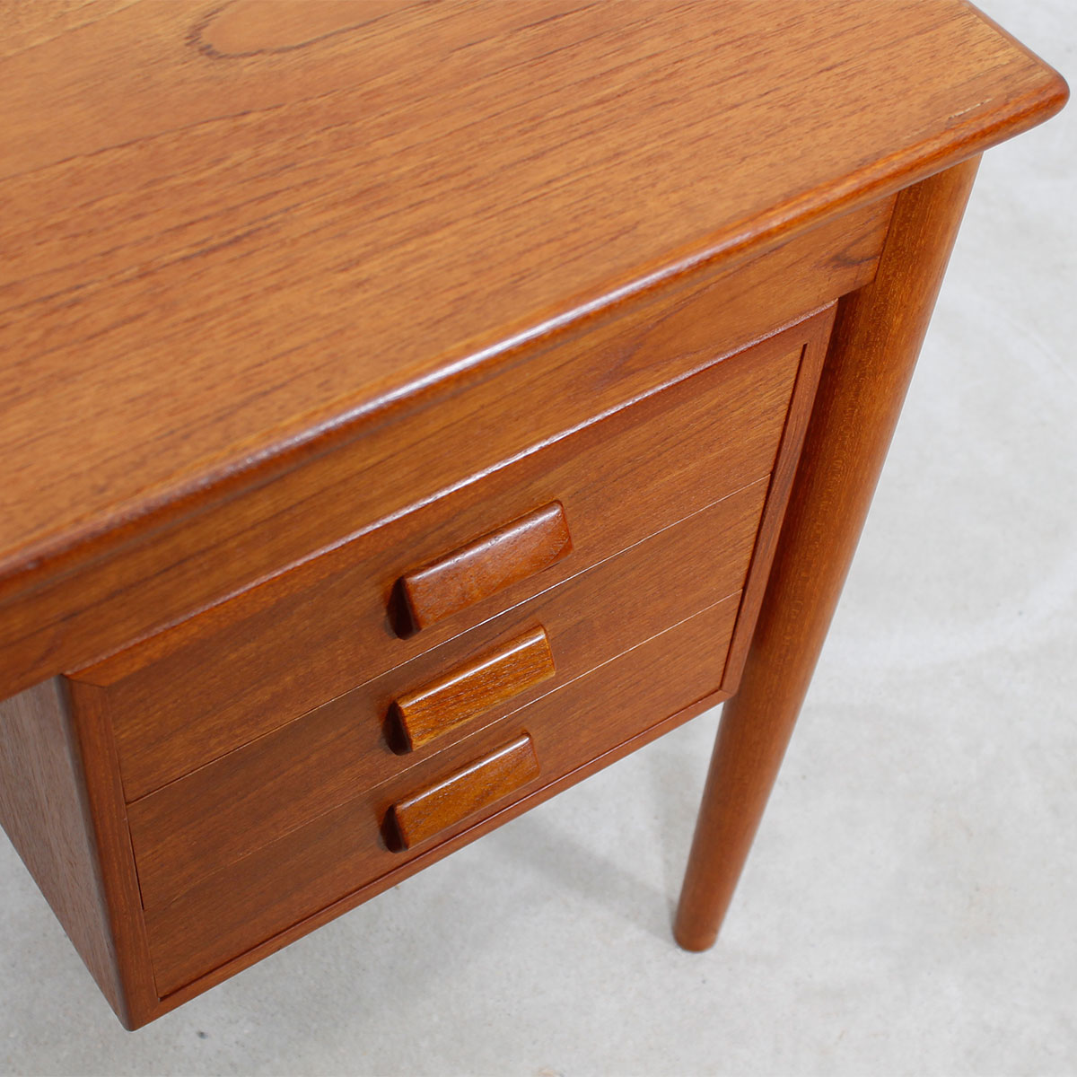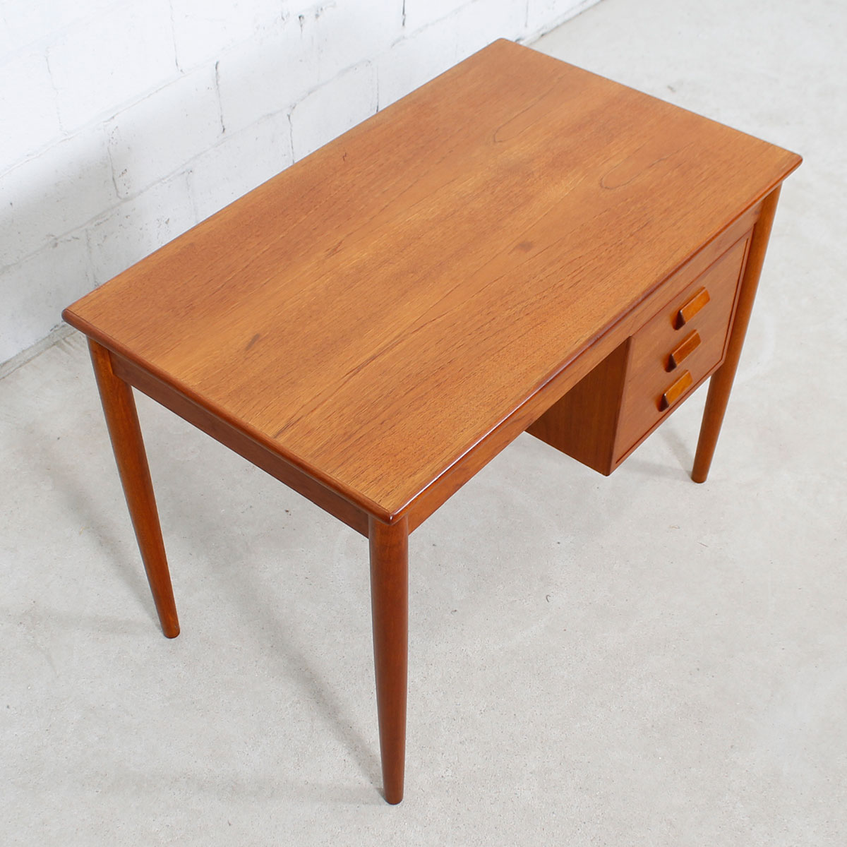 For your smallest work area we offer this extremely compact Danish Modern teak desk designed by Borge Mogensen. Small but fully functional for writing or laptop work, it has three drawers on the right hand side. The drawerrs each have a beautiful rectangular hooded inset handle. Tapered turned legs complete the wonderful design, and the desk if finished on the back so it may be used in the middle of a room.