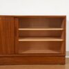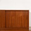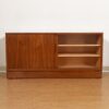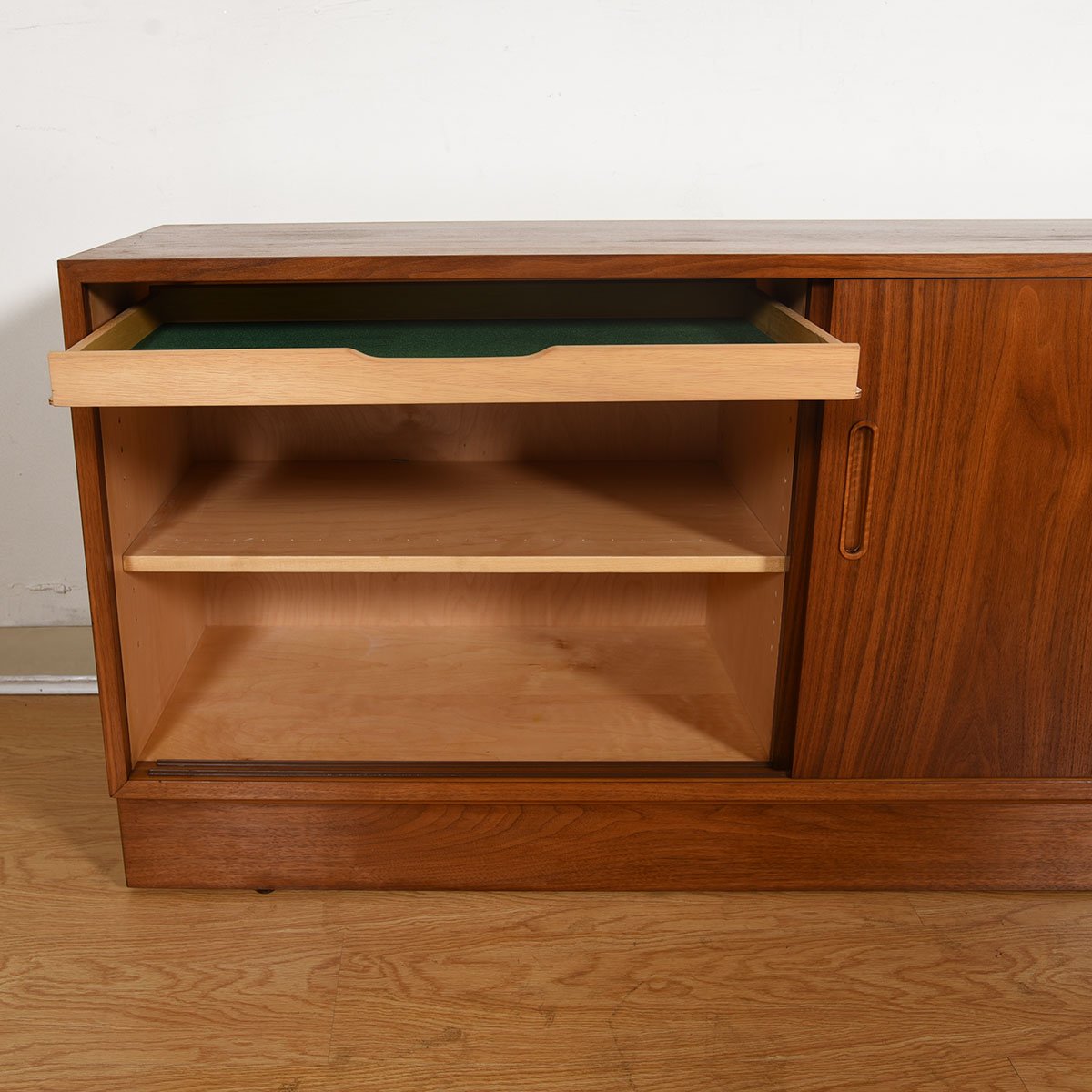 Its compact-size and sliding doors, storage space and adjustable shelving make this Danish Modern teak cabinet the ideal choice for your media needs. One shallow drawer is perfect for holding the remote controls. Beautiful figuring on the doors.