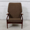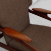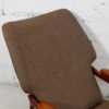 The solid teak frame has wonderful sculptural armrests that echo the wing detail on the backrest of the chair. Very sturdy and grounded yet it manages to give the viewer a sense of lightness, humor and aero dynamism thanks to wonderful Danish design. The frame has aged to a deep dark patina and the seat and backrest are upholstered in brown fabric.