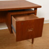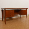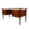 Gorgeous Danish Modern Desk with “floating” top. Three small drawers on left and one large file drawer on right of kneehole. The desk has a bookcase front making it fully functional and able to be placed in the center of a room. The teak has aged to a dark honey patina.