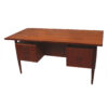 Classic teak desk with floating top. Great mid sized desk that offers ample storage with not only three smaller drawers for traditional storage on the left, but also a file drawer on the right. Additionally, it has a finished front providing two ‘cubbies’ and a shelf for additional space — this also allows for flexibility in placement in a room! In excellent condition with stunning rich dark teak patina.