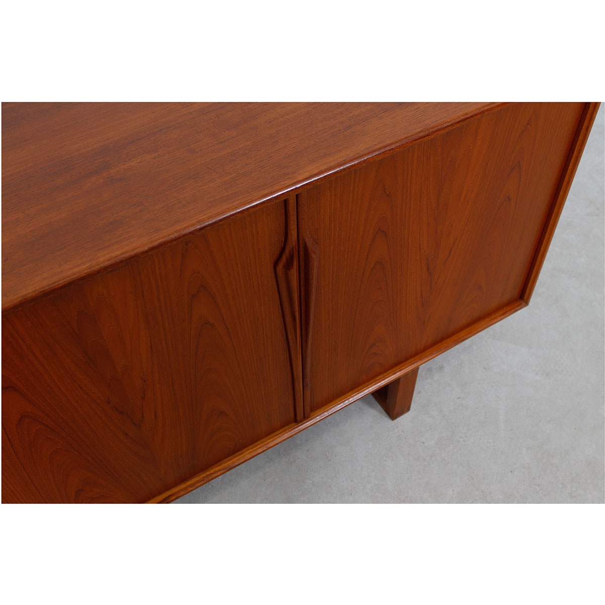 We are pleased to offer this beautiful Danish Modern sideboard in a size that is not too small – not too large. Designed by Gunni Omann it is made of teak. As you can see in the photos, the graining has been carefully placed on the three sliding front doors. The left and the right door each have the sculptural pull in the shape characteristic to Omann pieces. The central door has two cunning circular pulls. The left door opens to three drawers and the other two open onto shelving.