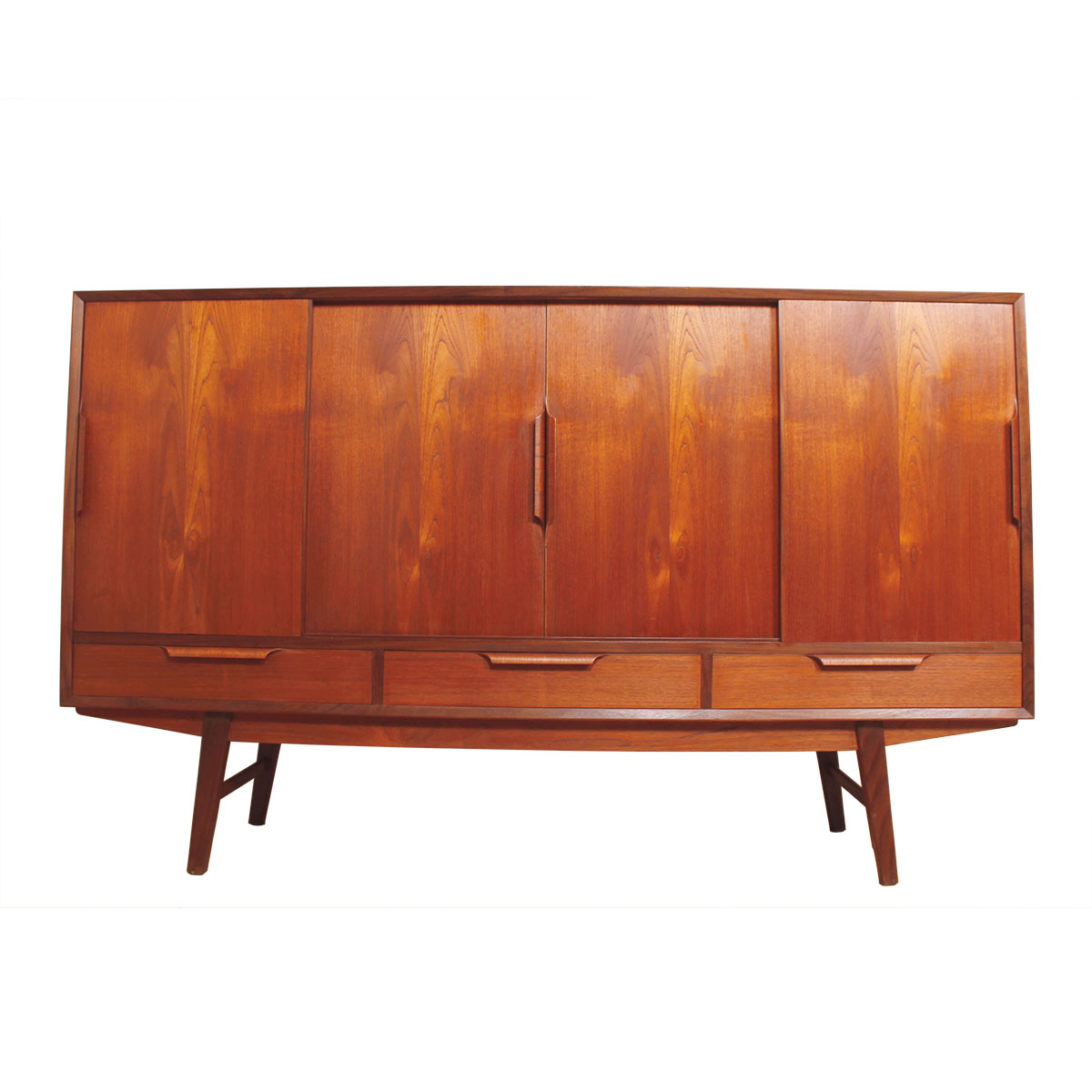 Gorgeous, older Danish Modern highboard in teak has four sliding doors on top and three drawers below, revealing an impressive amount of storage. Sits on a base with smallish splayed legs making it very sturdy and the thin, sculpted pulls highlight the craftsmanship that went into this piece.