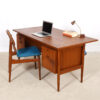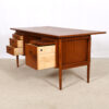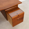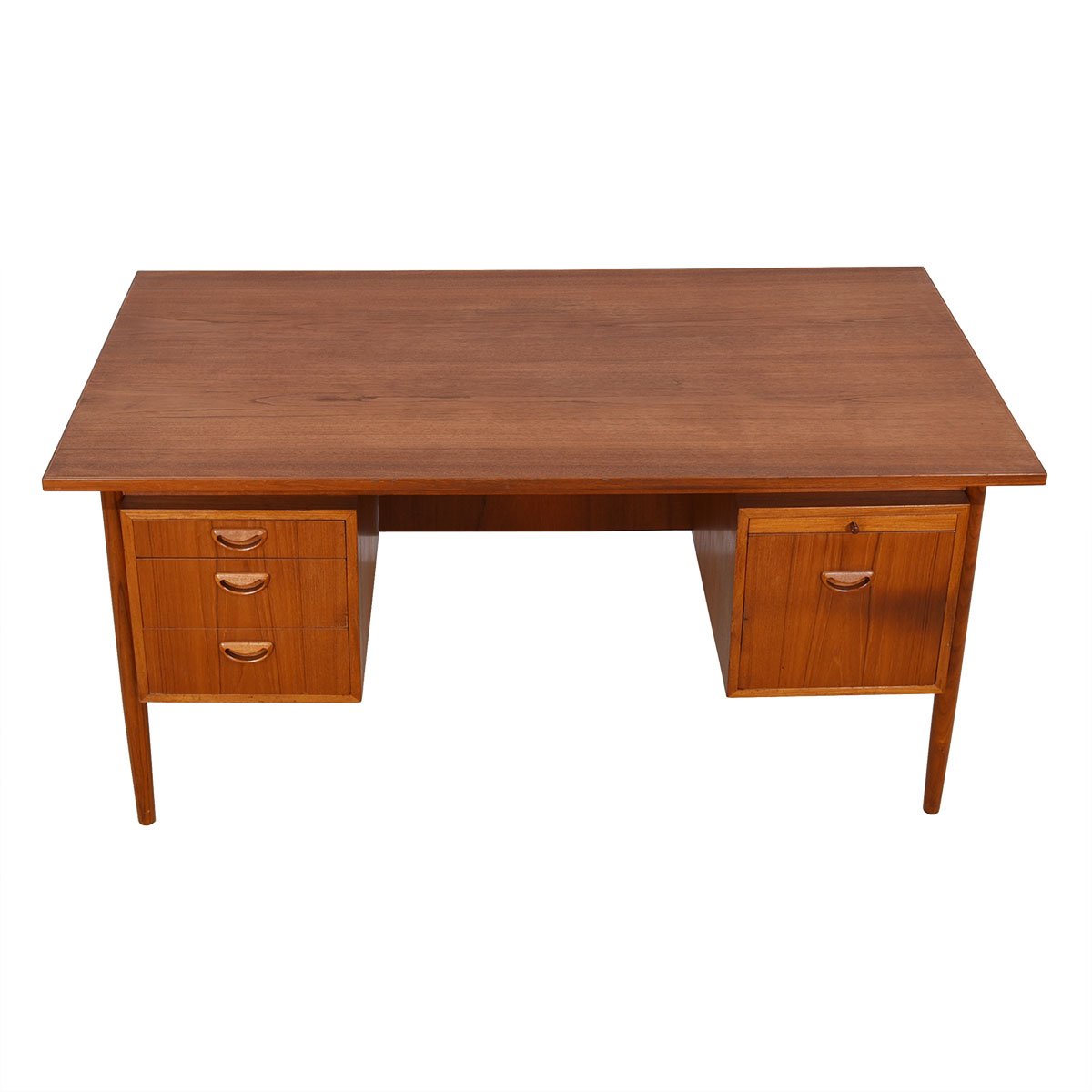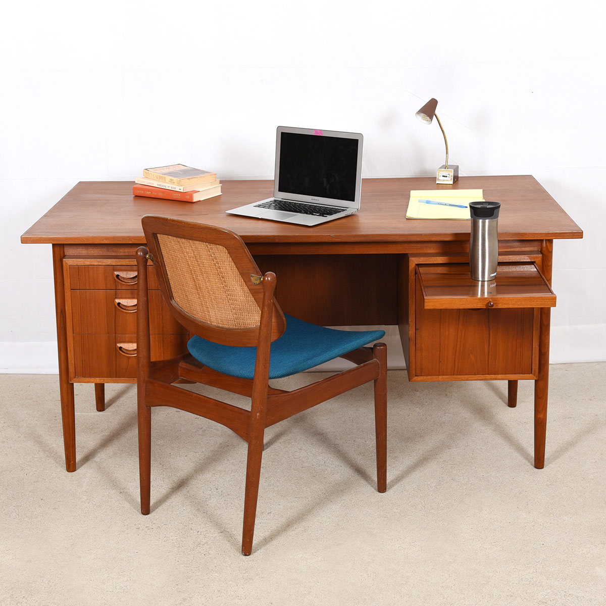 This handsome Danish Modern executive desk in teak has a large work surface and plenty of storage. On the left side of the kneehole are three graduated drawers, and on the right a large file drawer.