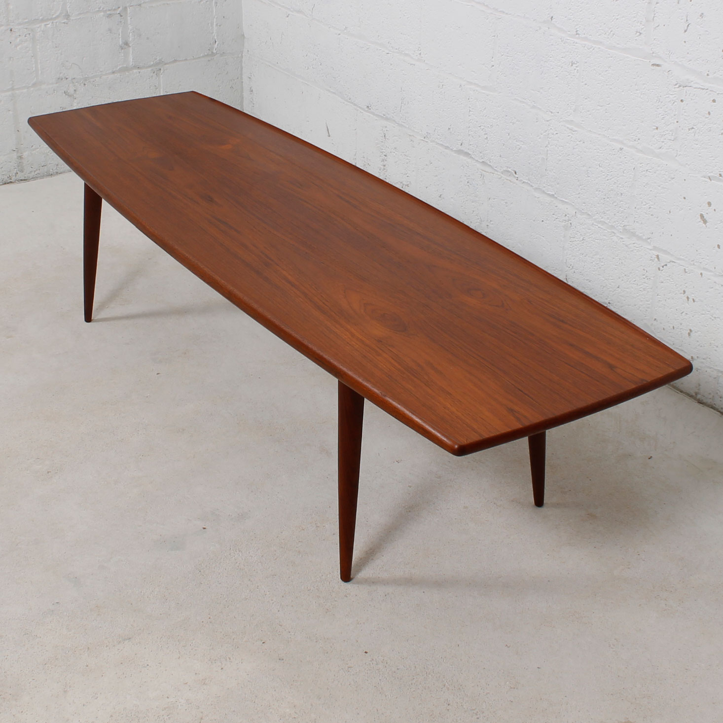 Riding the crest of cool is this long Danish Modern teak coffee table with a surboard shape. It has gentle raised edges on the long sides and ever-so-slightly splayed legs. The teak has nicely aged to a rich patina. This table is a classic beauty!