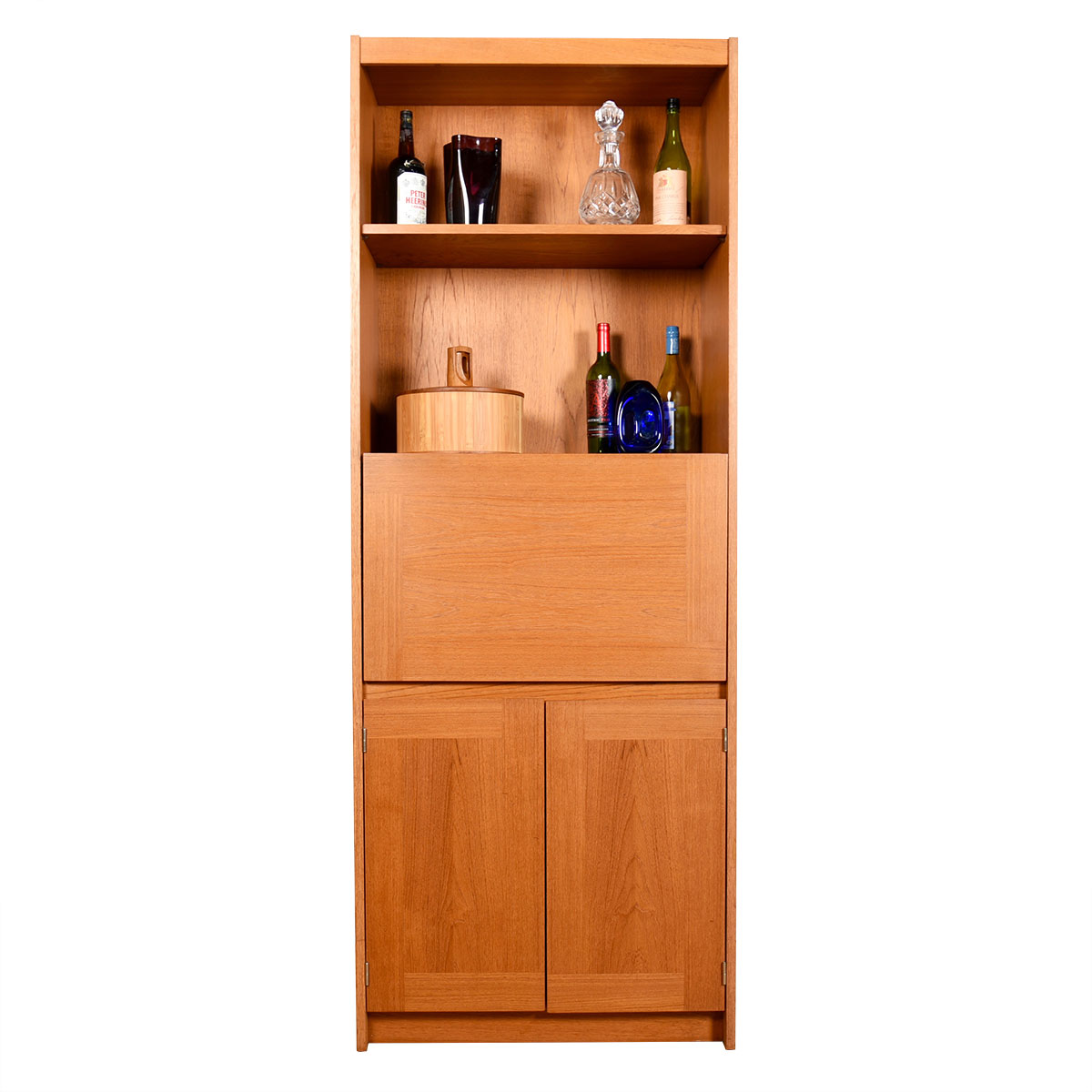 Danish Modern Teak Mirrored Bar Cabinet | Bookcase w: Closed Storage
