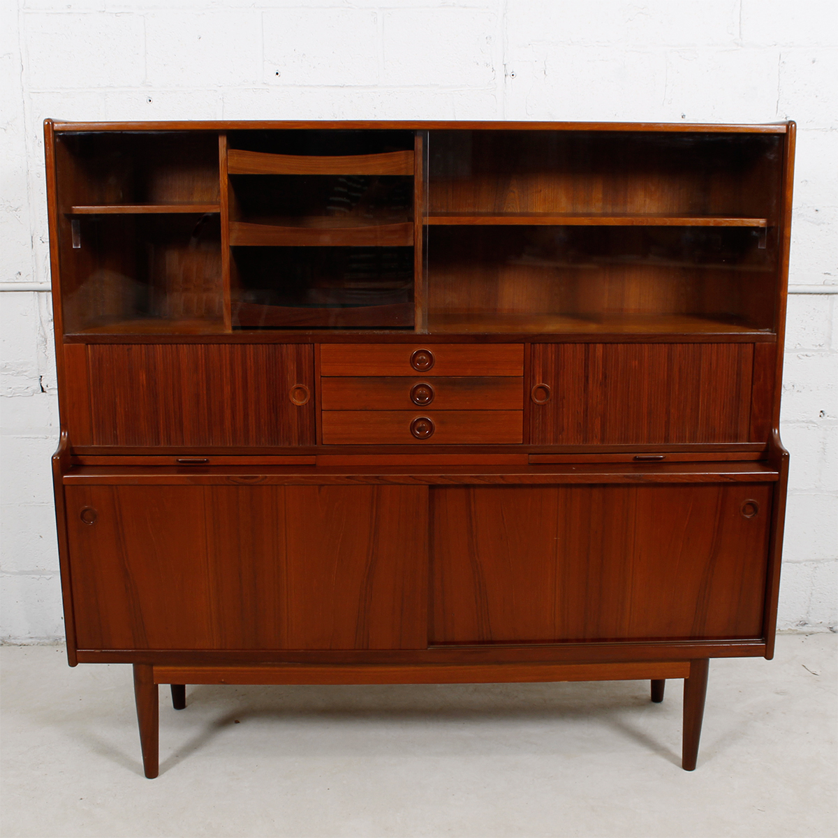 This impressive Danish Modern highboard has got it all going on! Recently imported from Denmark for us by our Danish supplier it has an abundance of beauty and functionality. The top section has both drawers and adjustable shelving, protected by sliding glass doors. The handleless drawers are variable in height and slightly off-center.