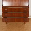 Three drawer secretary desk with drop down front that creates the work surface and conceals trays and cubby storage.