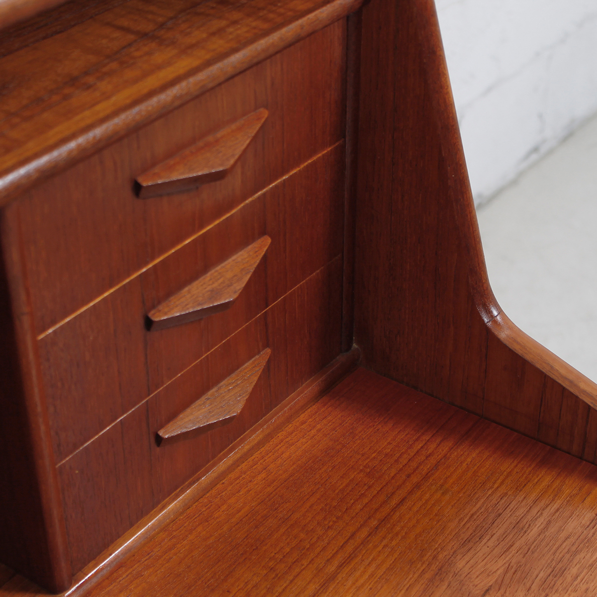 The defining design feature of this piece is the sculptural “V”-shaped pull on each drawer, reminiscent of the old “Pontiac”. The graining of the teak on this piece is lovely and very thoughtfully placed. Aside from being used as a work station, this piece of furniture could easily serve as a vanity / dressing table.