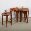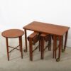 This is the table that keeps on giving! Not only is it a beautiful Danish Modern coffee table, but four nesting tables store underneath to make it super functional. Bring the small tables out when it’s family night around the television then neatly tuck them away when you’re done. Or, scatter the four extra tables around your home wherever you need them. The teak has aged to a deep, rich patina and the simple design will fit in with almost any decor.