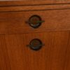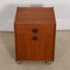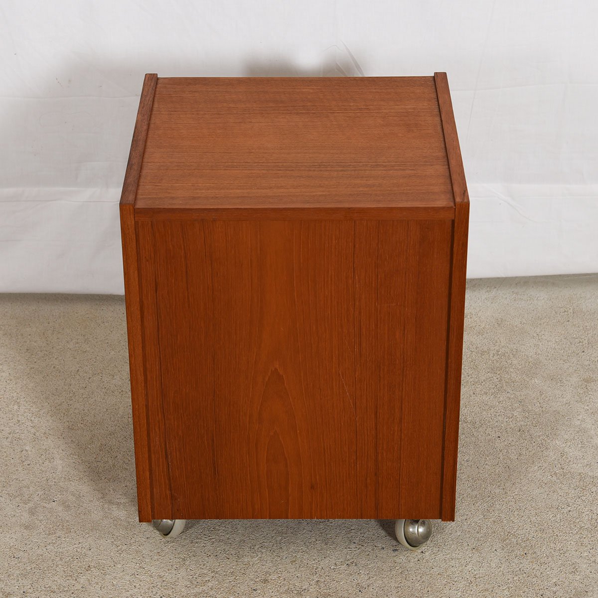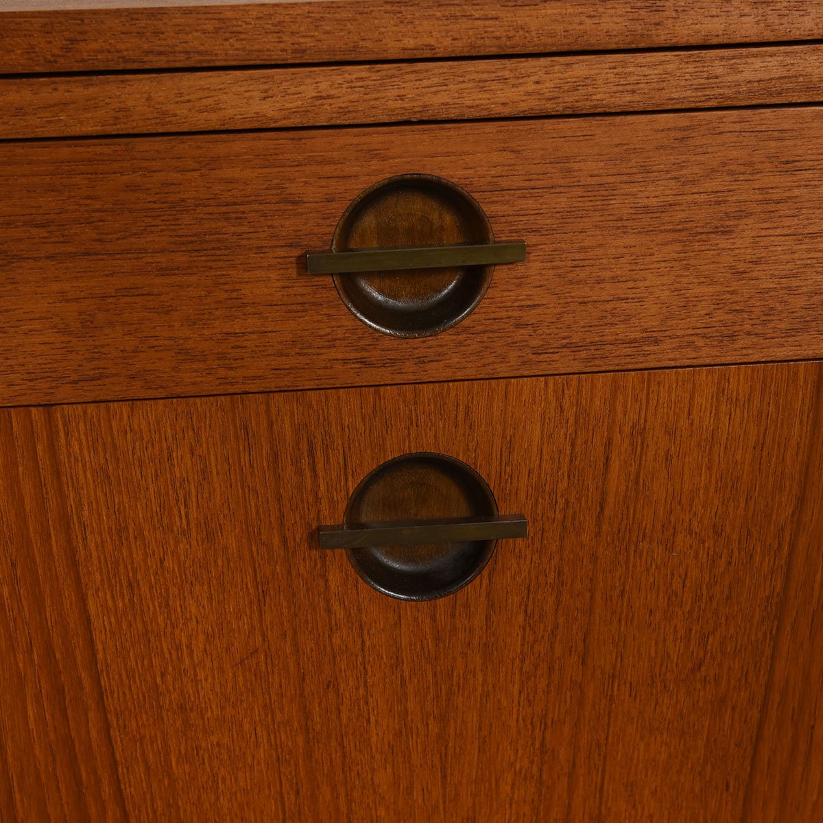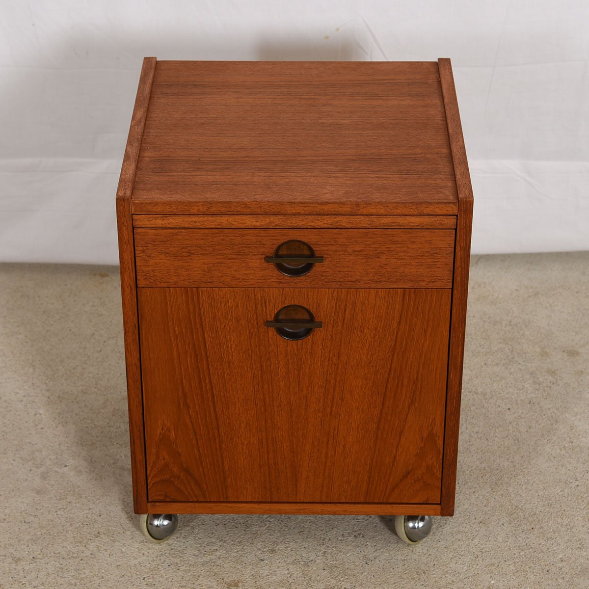 Featured is a versatile Danish Modern end table / nightstand in Teak. The front features two handles — a sculpted circle with a crossbar. The top handle opens to a shallow drawer that has a pull-out shelf to create additional table surface. The bottom handle pulls down to reveal cubby space.