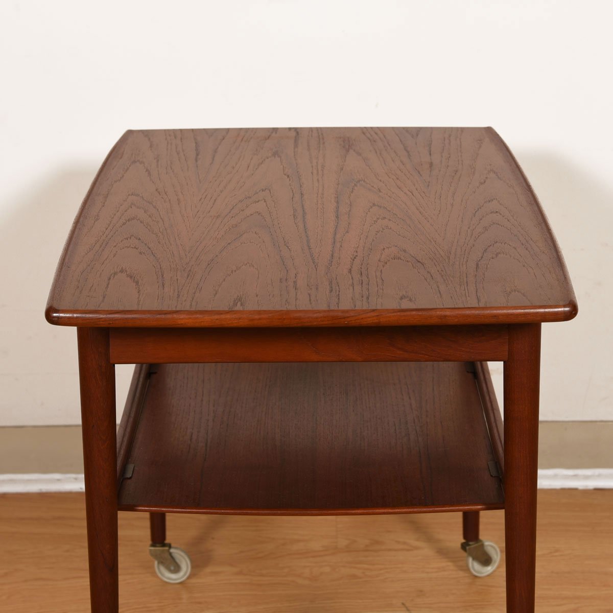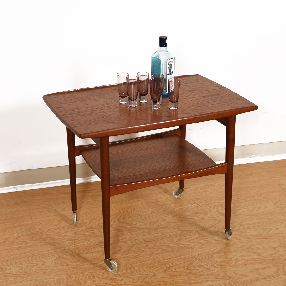 - Sleek table top with lipped edge running the length makes an elegant statement on this Danish teak rolling bar cart