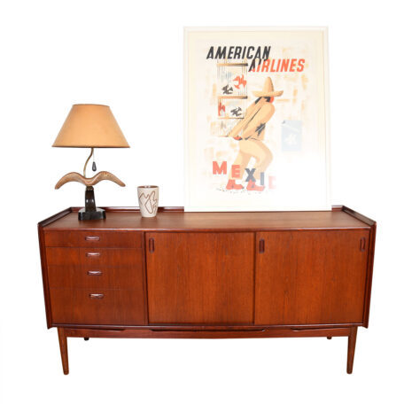 Gorgeous and full of storage, this teak sideboard attributed to Mogens Kold, Denmark, will help you organize in style. Old style craftsmanship throughout & taller than most with a height of 34.5″.