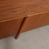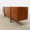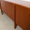 In beautifully figured teak, we present an extra long sideboard, circa 1960s. This vintage piece offers creative design where the leg detail extends into the handles of the doors. The interior of the chest has four drawers and adjustable shelves.