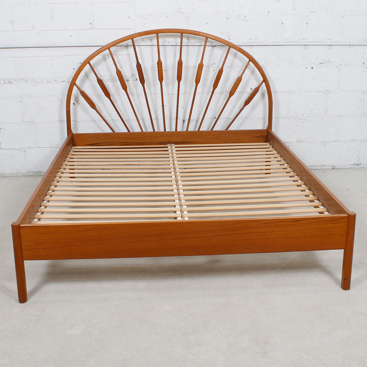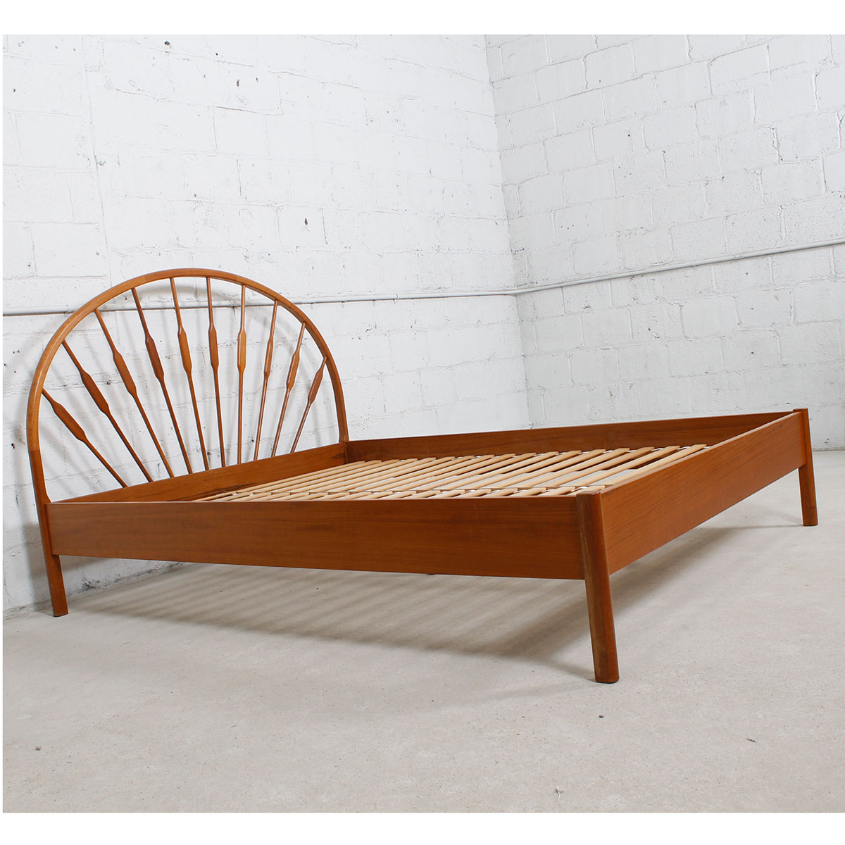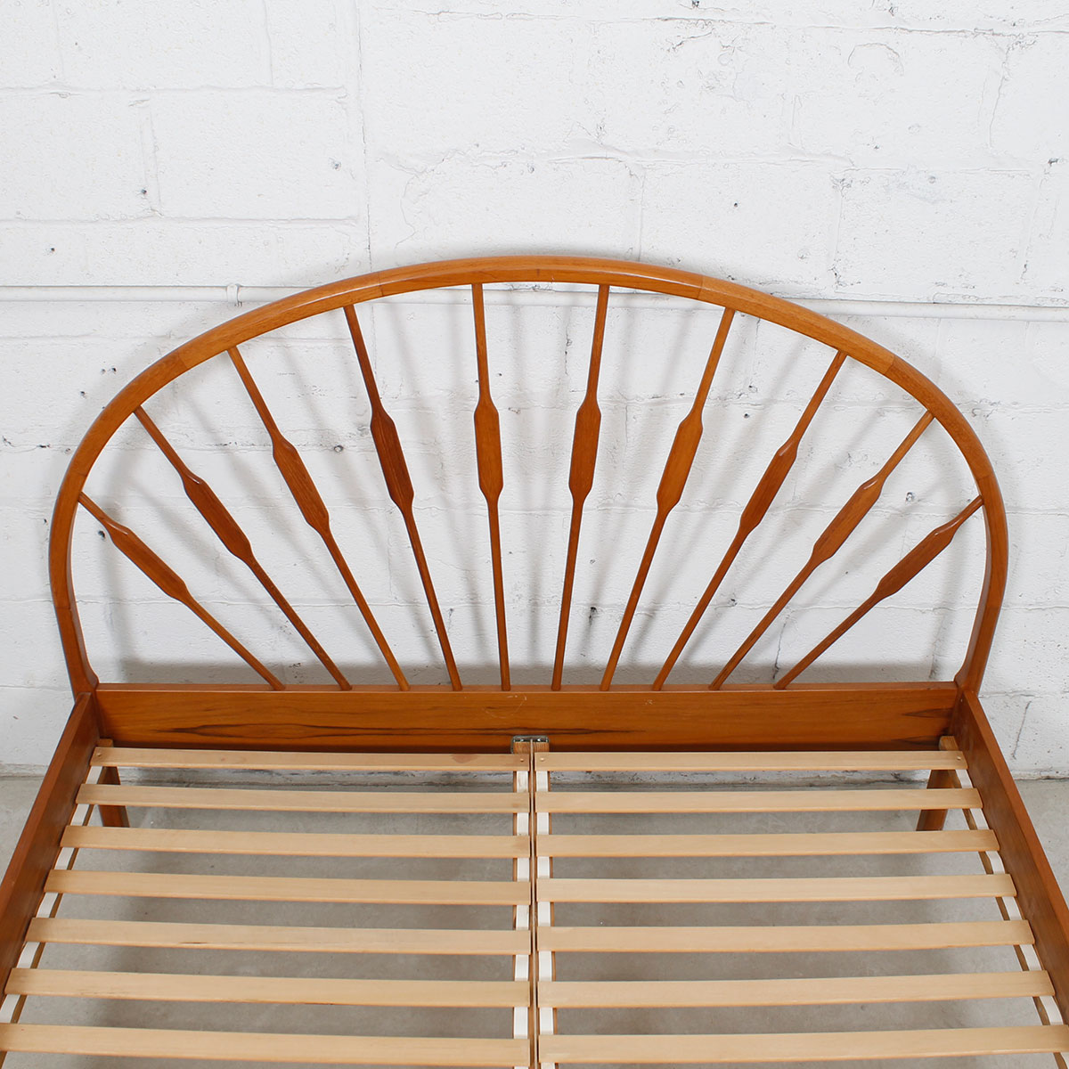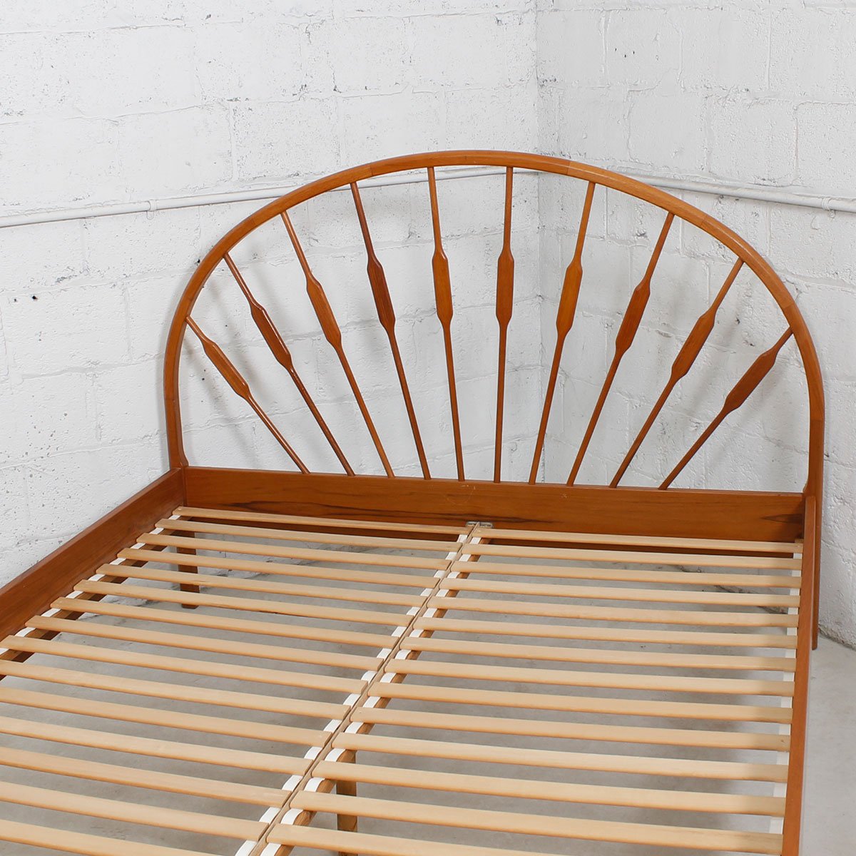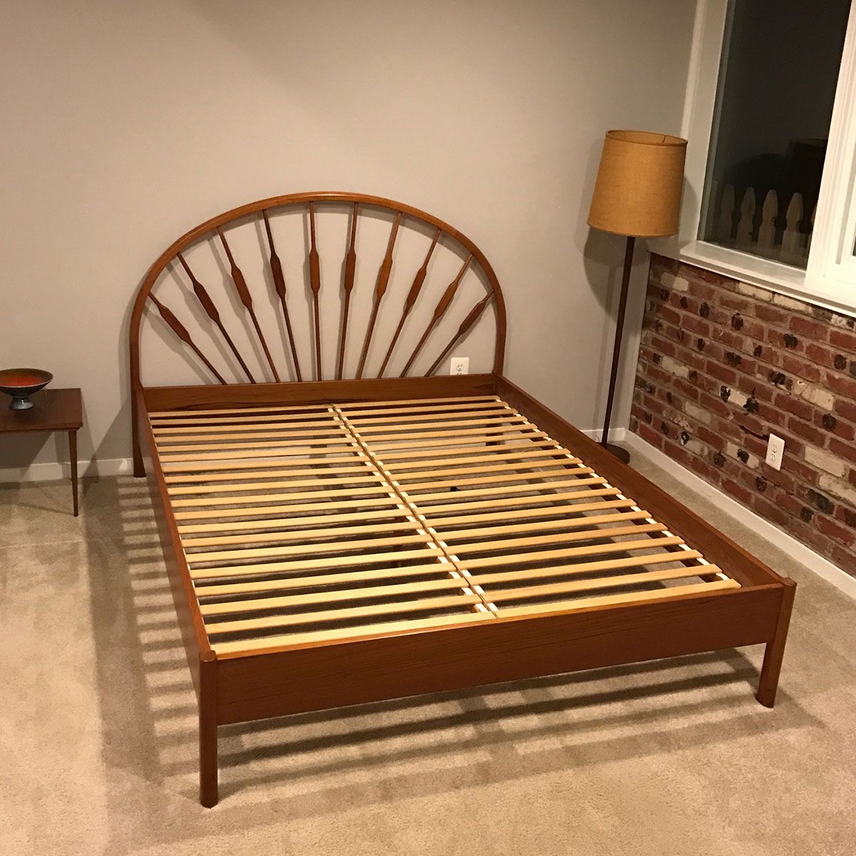 Danish Modern Teak Spindle Queen Bed Frame w/ “Peacock” Headboard