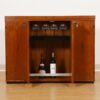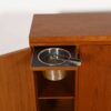 Plenty of storage, great details and beautiful teak make this compact rolling bar a winning selection. The side doors open with a circular chrome pull. Behind the left door is a built in ice bucket that slides out. Behind the right door and the central locking doors are shelving. The top slides open to reveal a laminated serving surface. Bring this out at your next party and let the good times roll.
