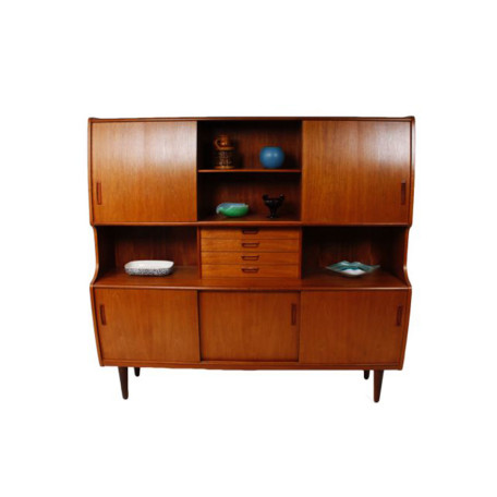 Wonderful teak piece that bows out and is supported on 4 thick legs, and has 3 sliding doors below, 2 above (with a display area in between) and a central open space area with a central stack of 4 drawers. Removable shelves throughout. Immediately below the middle display area to the right behind the door are 2 felt-lined drawers. Further accented with sculpted pulls.