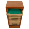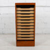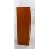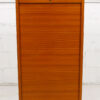 This tall Danish Modern cabinet is perfect for storage of small precious items such as jewelry. Made of teak it has a vertical tambour door that locks. Inside, there are eleven shallow drawers that pull out for easy accessibility. The drawers are lined with felt to protect your valuables. A good-looking and function piece.