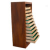 This tall Danish Modern cabinet is perfect for storage of small precious items such as jewelry. Made of teak it has a vertical tambour door that locks. Inside, there are eleven shallow drawers that pull out for easy accessibility. A good-looking and function piece.