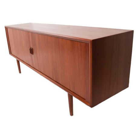 Teak Sideboard Designed by Svend Aage Larsen for Faarup Møbelfabrik, Denmark. Featuring Tambour Doors That Slide Open to Reveal Four Felt Lined Drawers and Two Adjustable Shelves. Finished Back for Great Use as a Room Divider.
