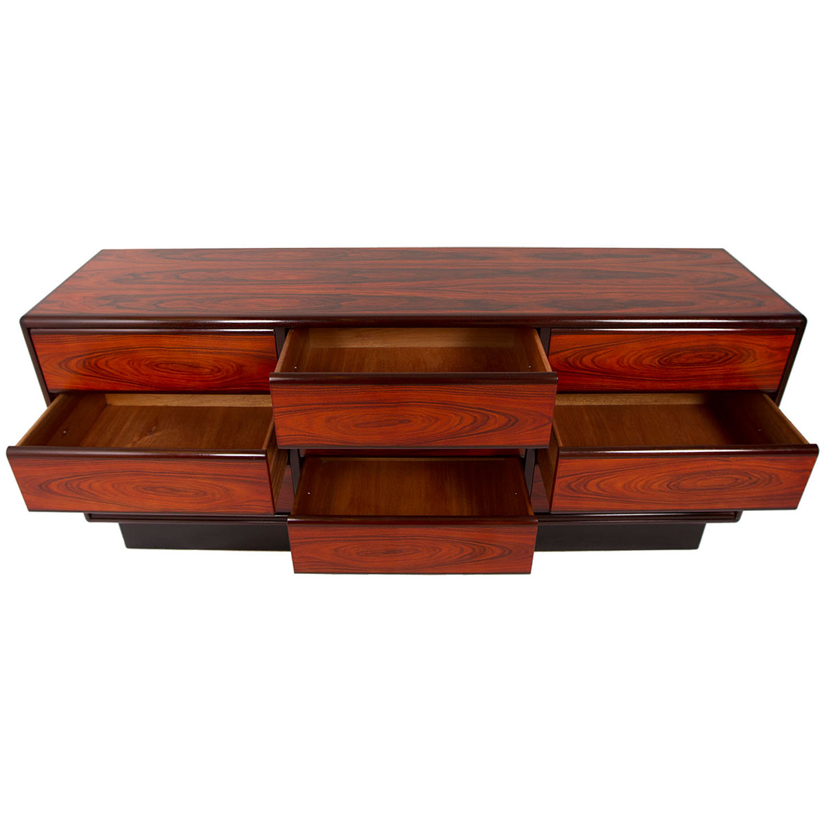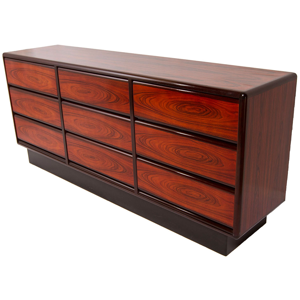 Nine deep & spacious drawers sit on top of a plinth base. Vibrant rosewood figuring throughout.