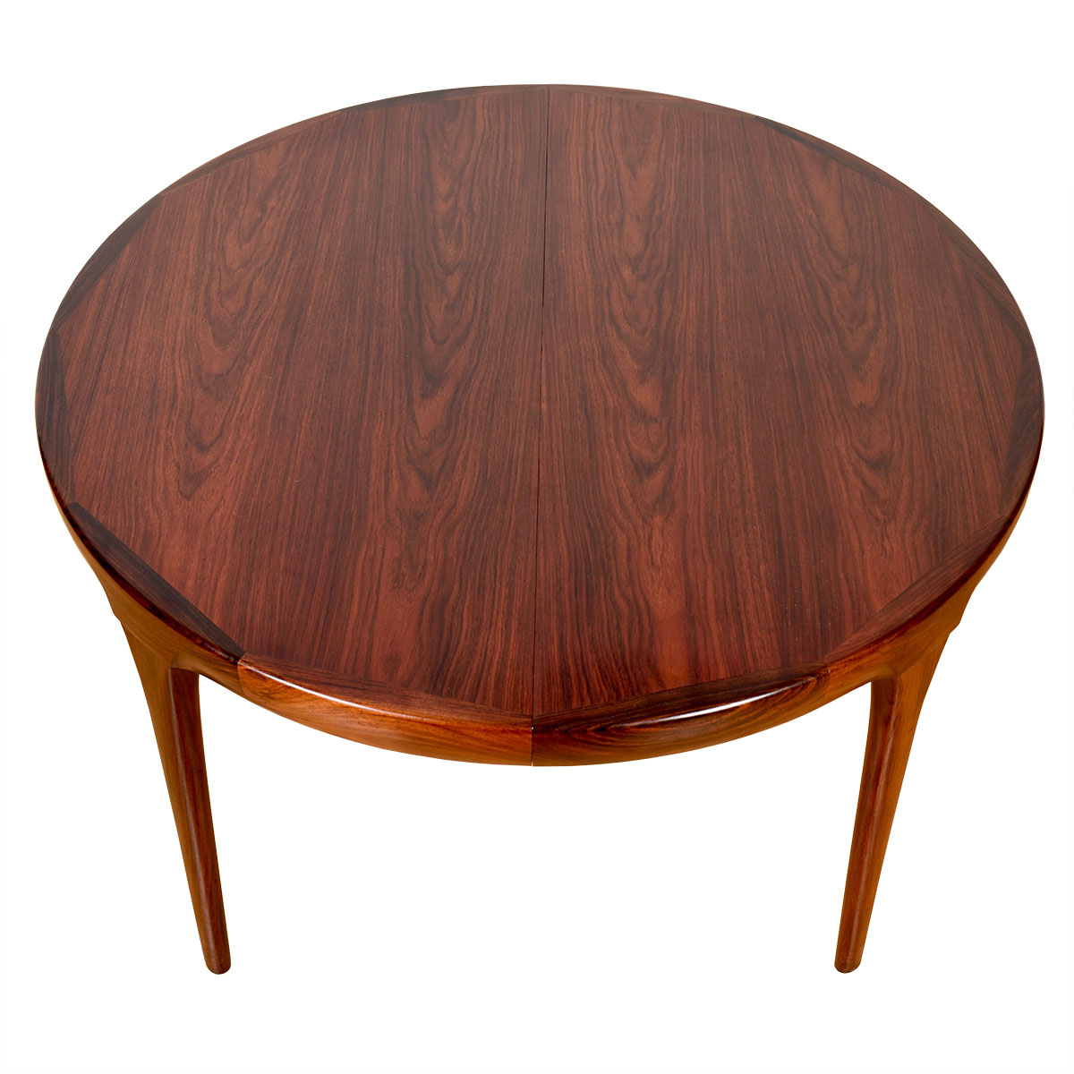 This beautiful Danish Modern rosewood table goes from round, spaciously seating 4, to an oval comfortably seating 8 to 10 people with the addition of 2 large leaves. The sturdy flared legs are placed at the edge so it is easy to place people at the table without fighting the legs.