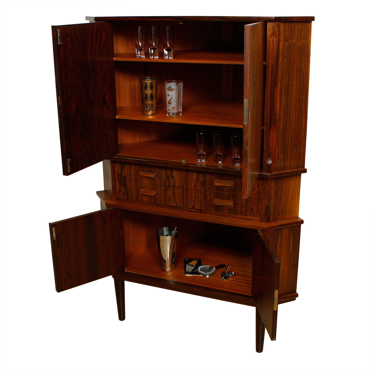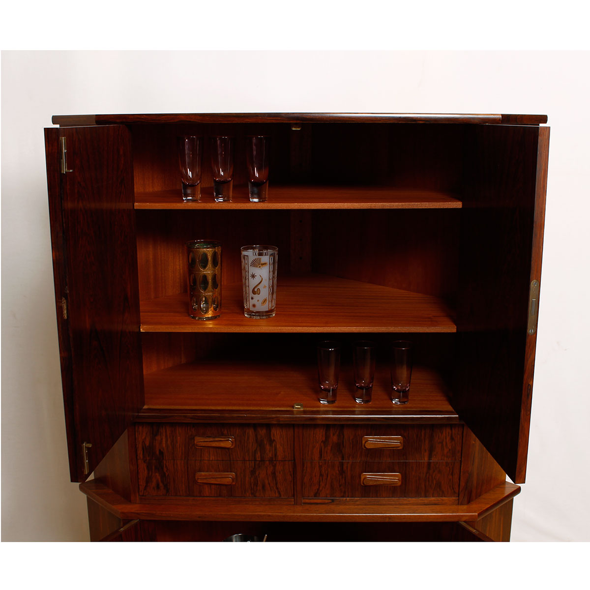 We are pleased to offer this fabulous Danish Modern corner cabinet / bar in rosewood. The grain on the doors has been carefully placed for maximum decorative effect, and the rosewood has aged well so that the exciting patterning is more visible.