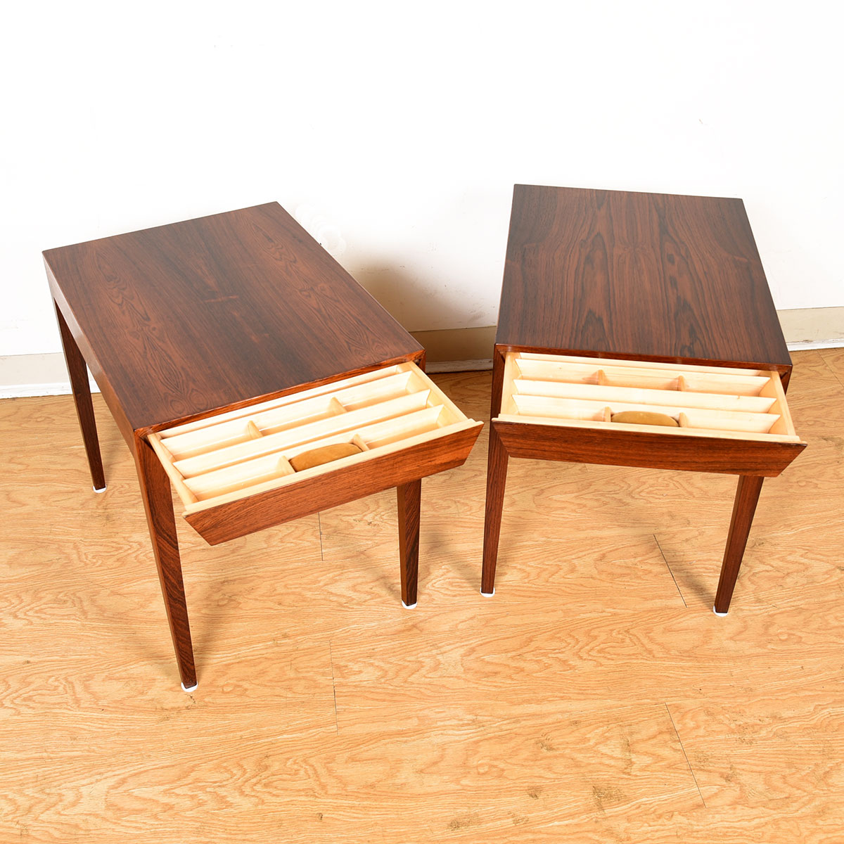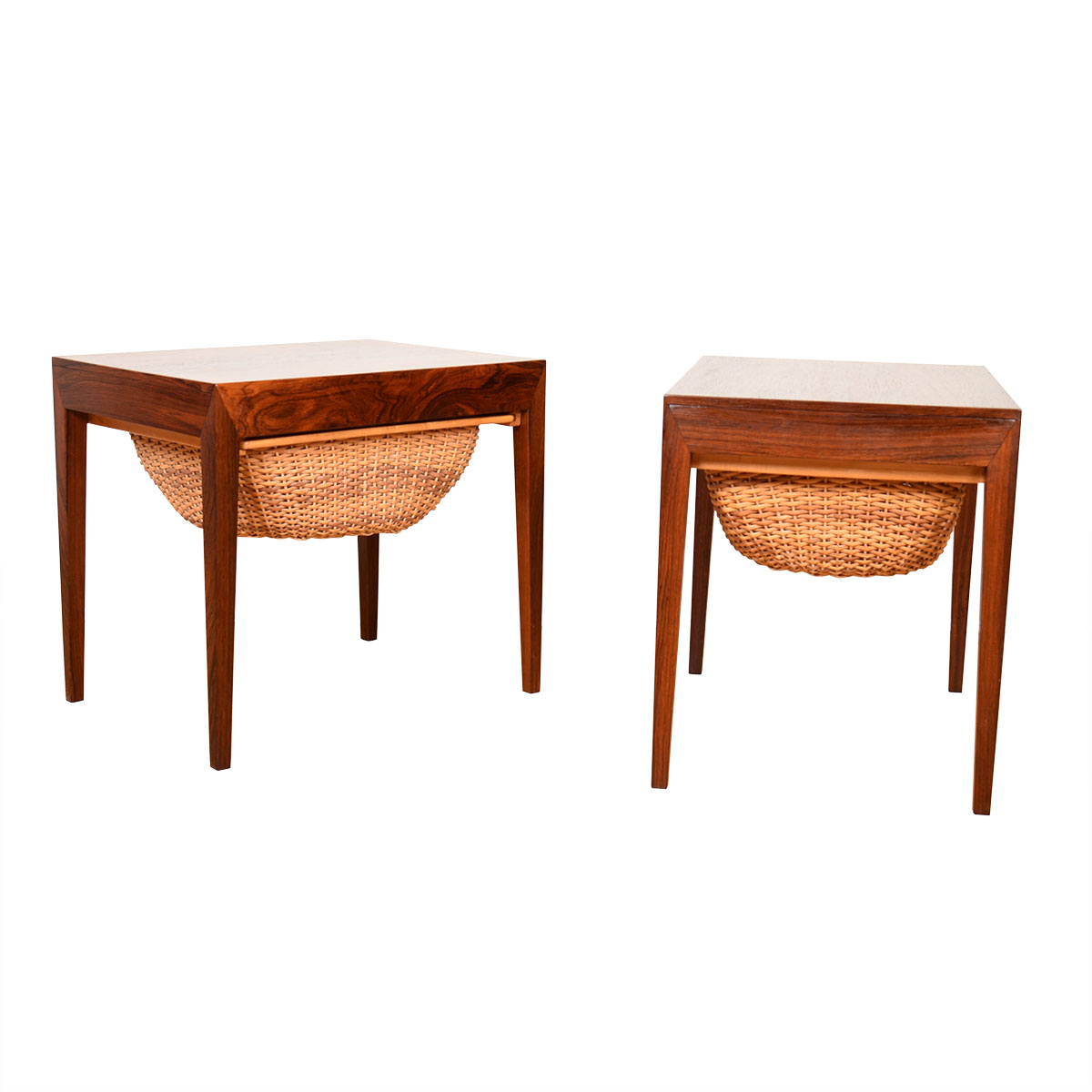 Danish Rosewood Pair Night Stands | Sewing Basket Tables w. Side Storage Drawer