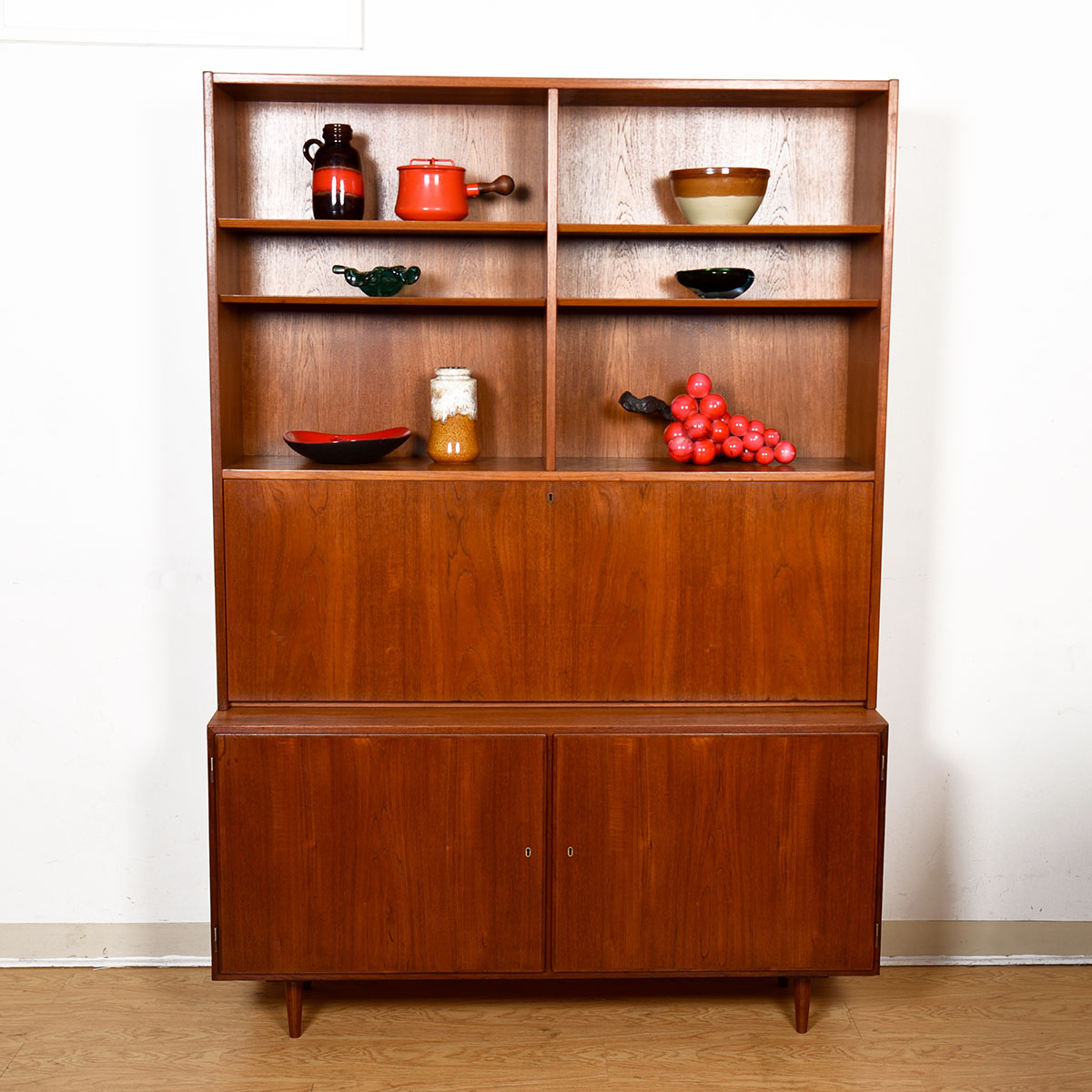 This is a 2-piece Danish Modern cabinet in teak with a multi-functional top that includes a locking drop down door, which can serve as a secretary desk or bar area.