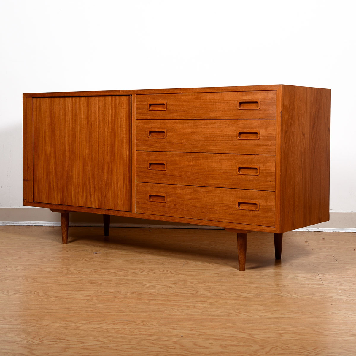 This Danish Modern cabinet has it all — 4 drawers plus shelving storage behind a tambour door. It has a compact footprint, making it perfect for smaller spaces and urban apartments.