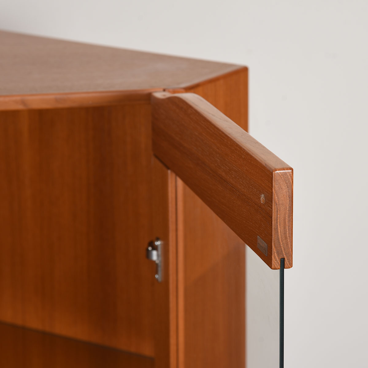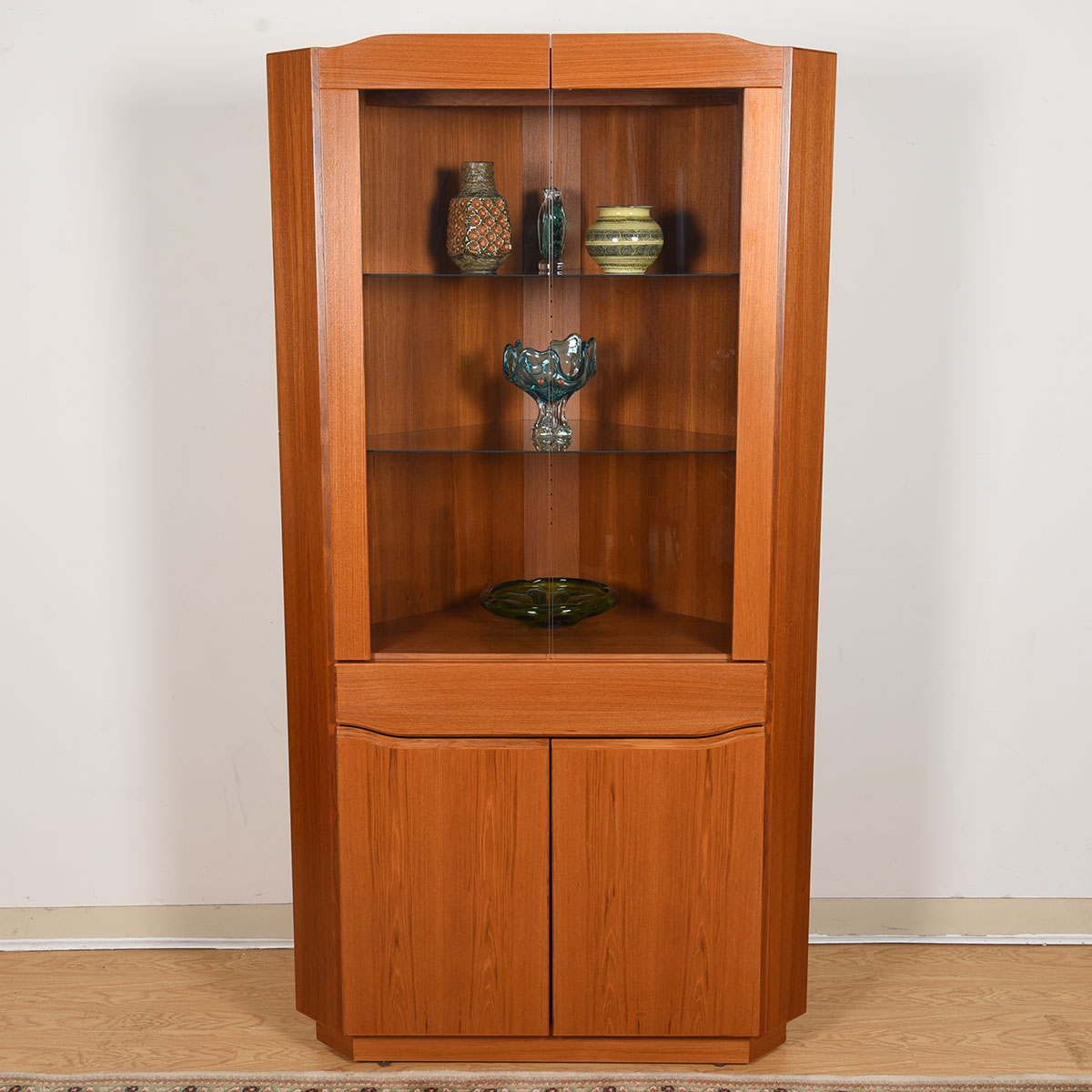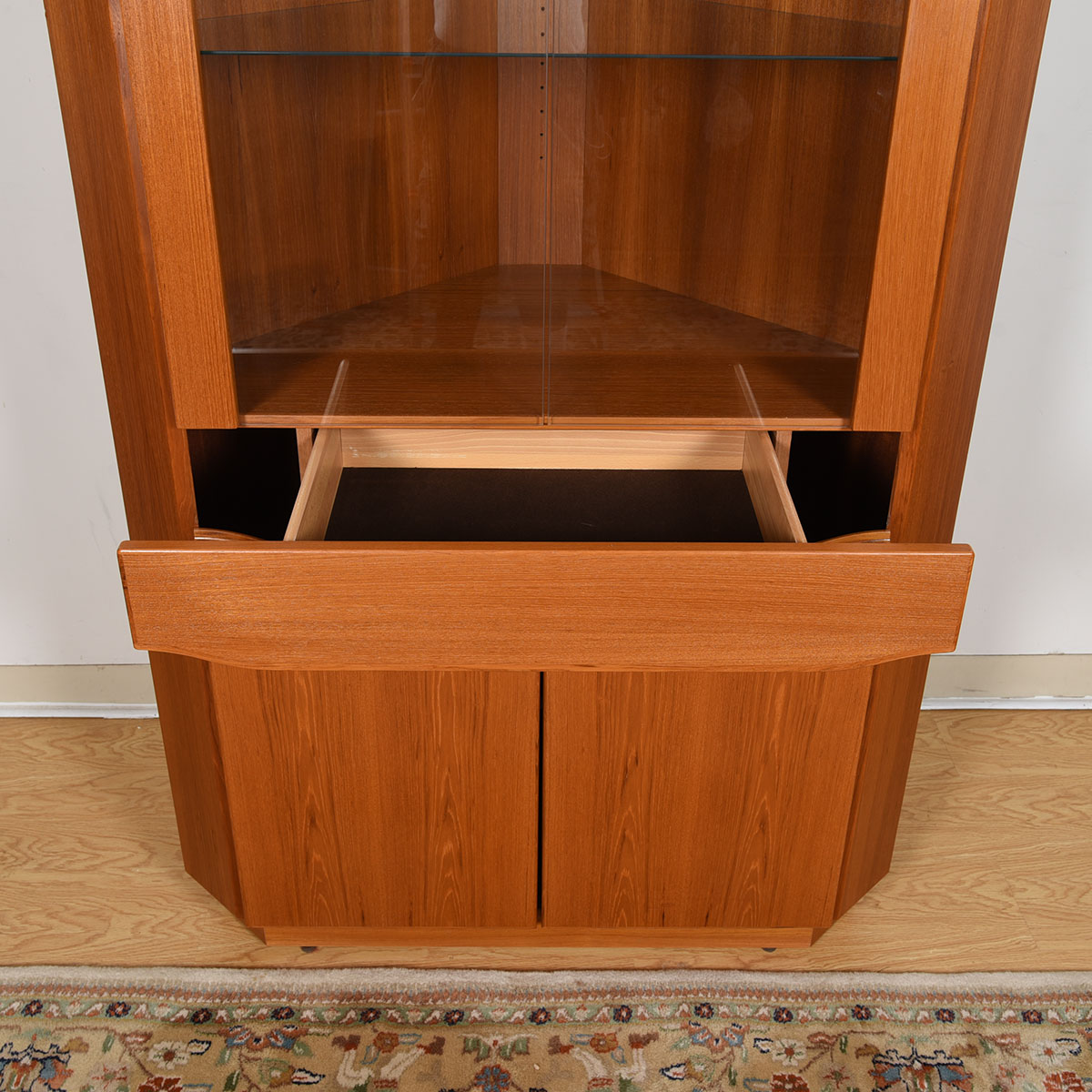 This Danish teak corner cabinet is large enough to accommodate your display needs while also serving to maximize space. Top area features glass doors for display. Central section has a felt-line pull-out storage drawer. Below, two doors open out revealing an adjustable wood shelf.