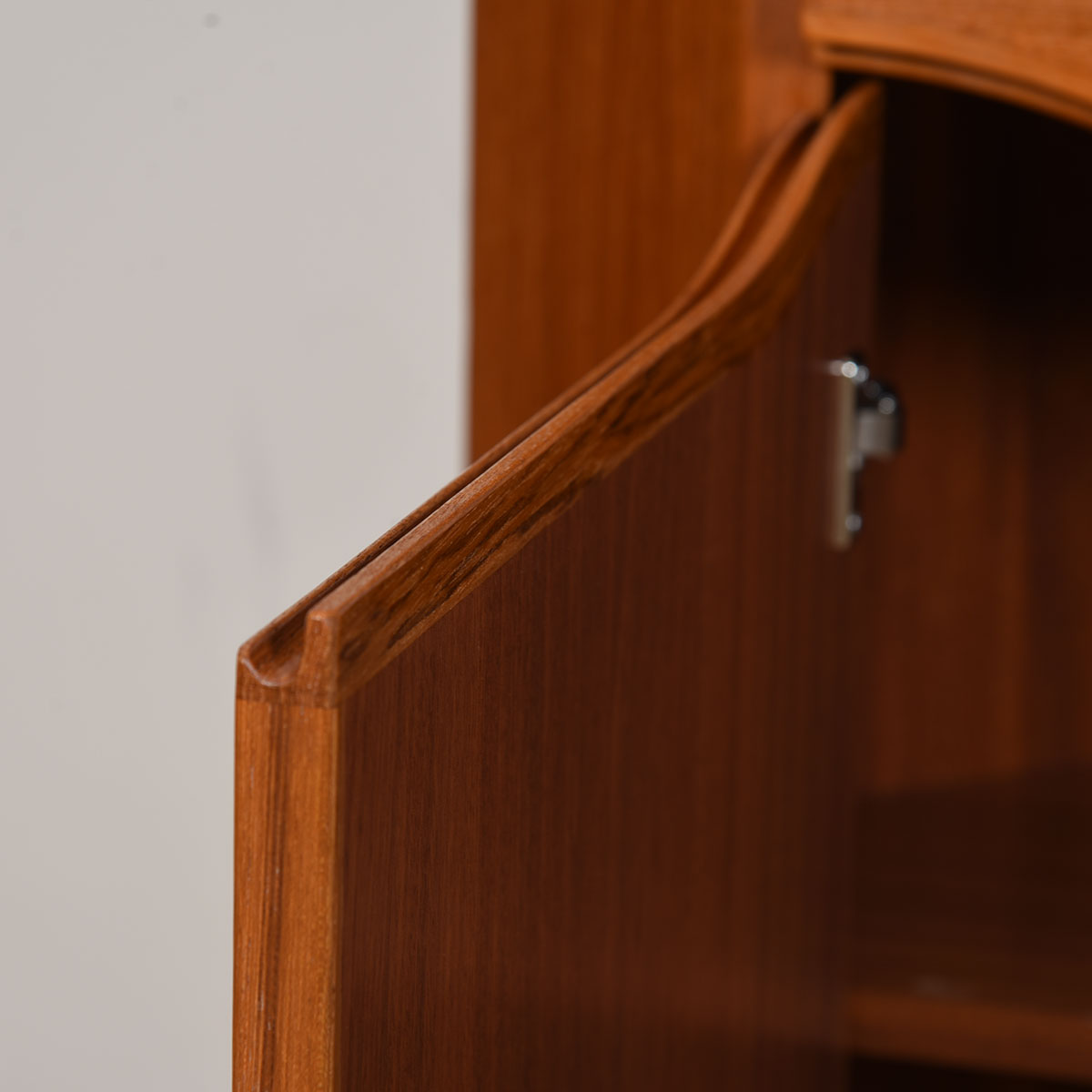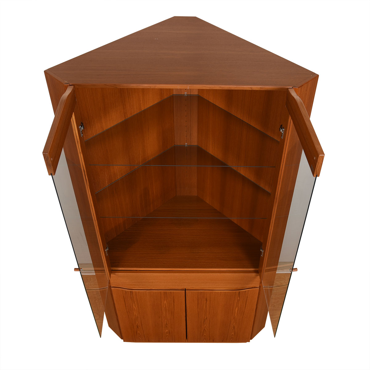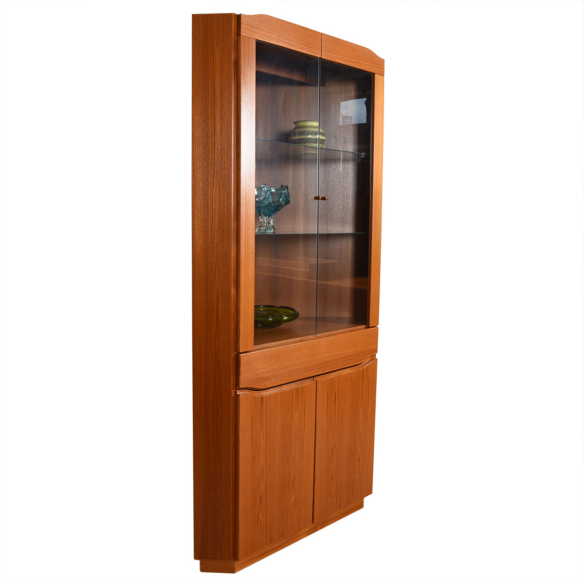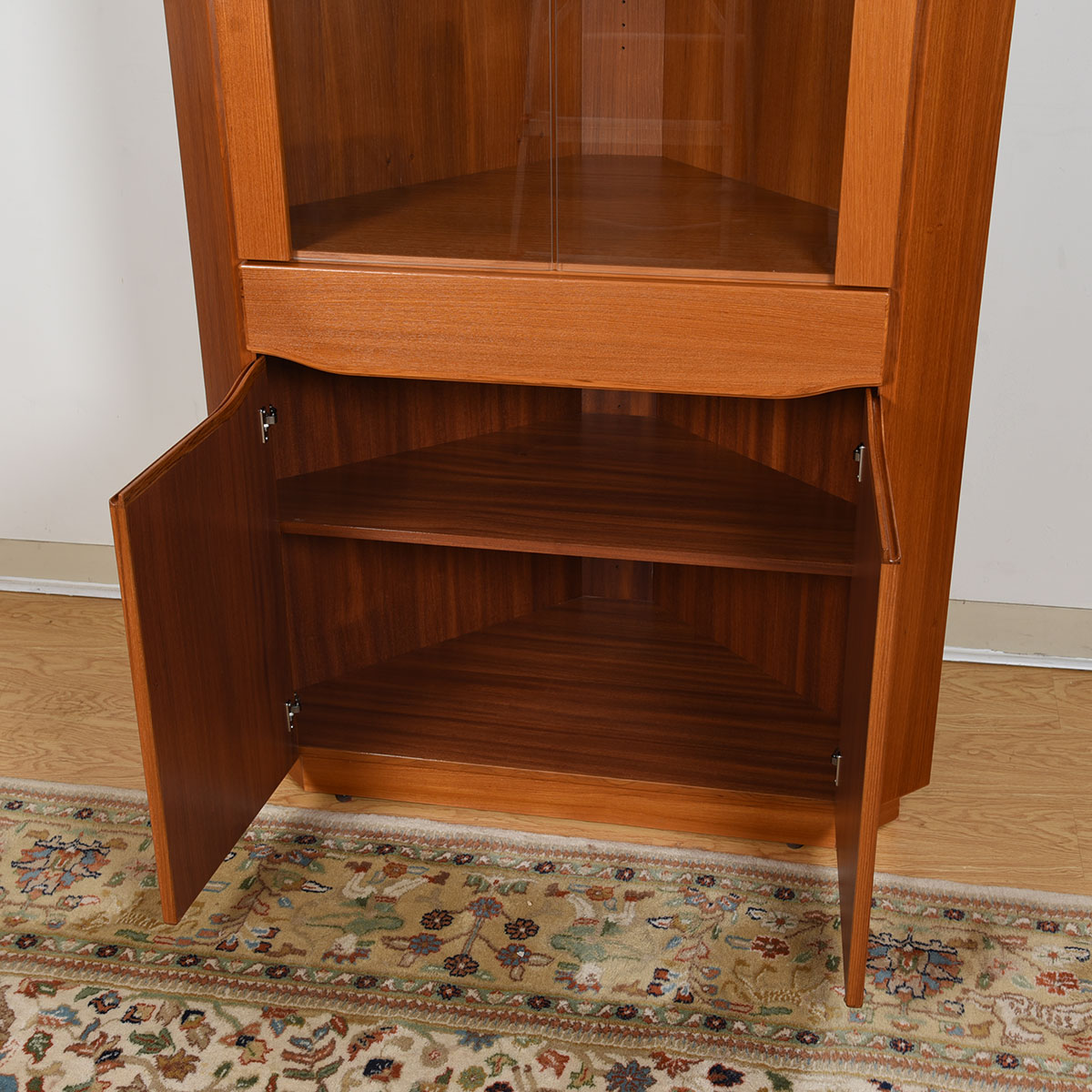 This Danish teak corner cabinet is large enough to accommodate your display needs while also serving to maximize space. Top area features glass doors for display. Central section has a felt-line pull-out storage drawer. Below, two doors open out revealing an adjustable wood shelf.