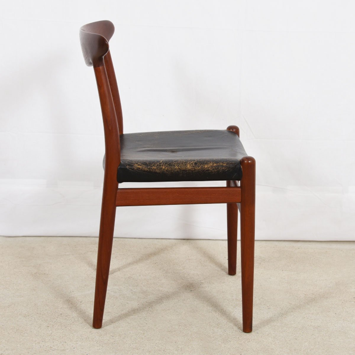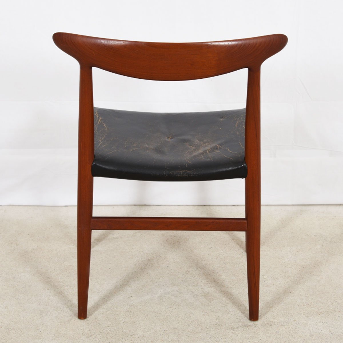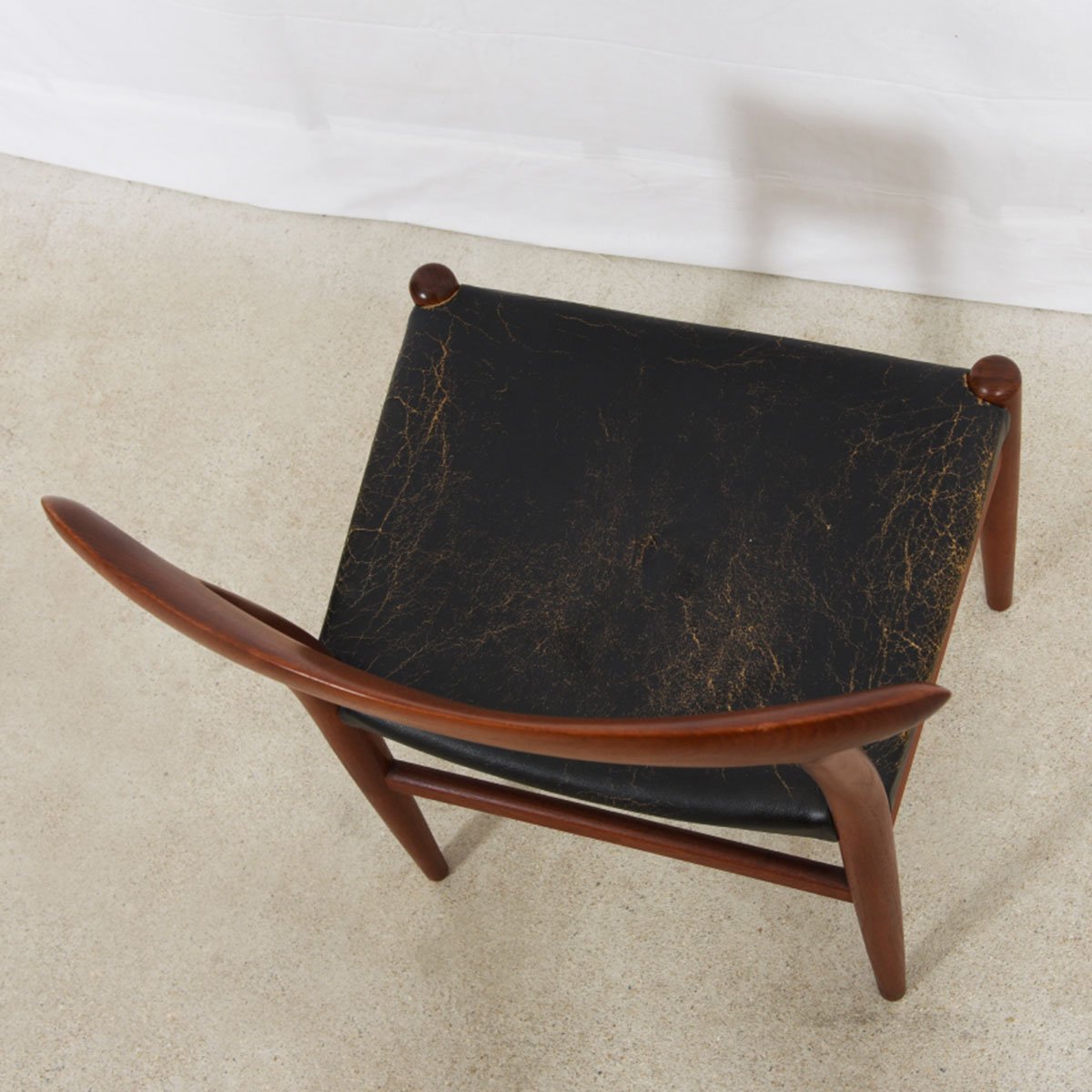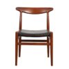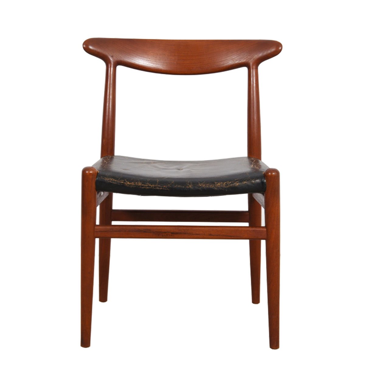 The W2 Chair by Hans Wegner — Danish Teak & Vintage Leather. Dark rich sculpted teak with black leather. Chair has heart shaped curved back and curved legs that highlight the world-famous Danish touch.
